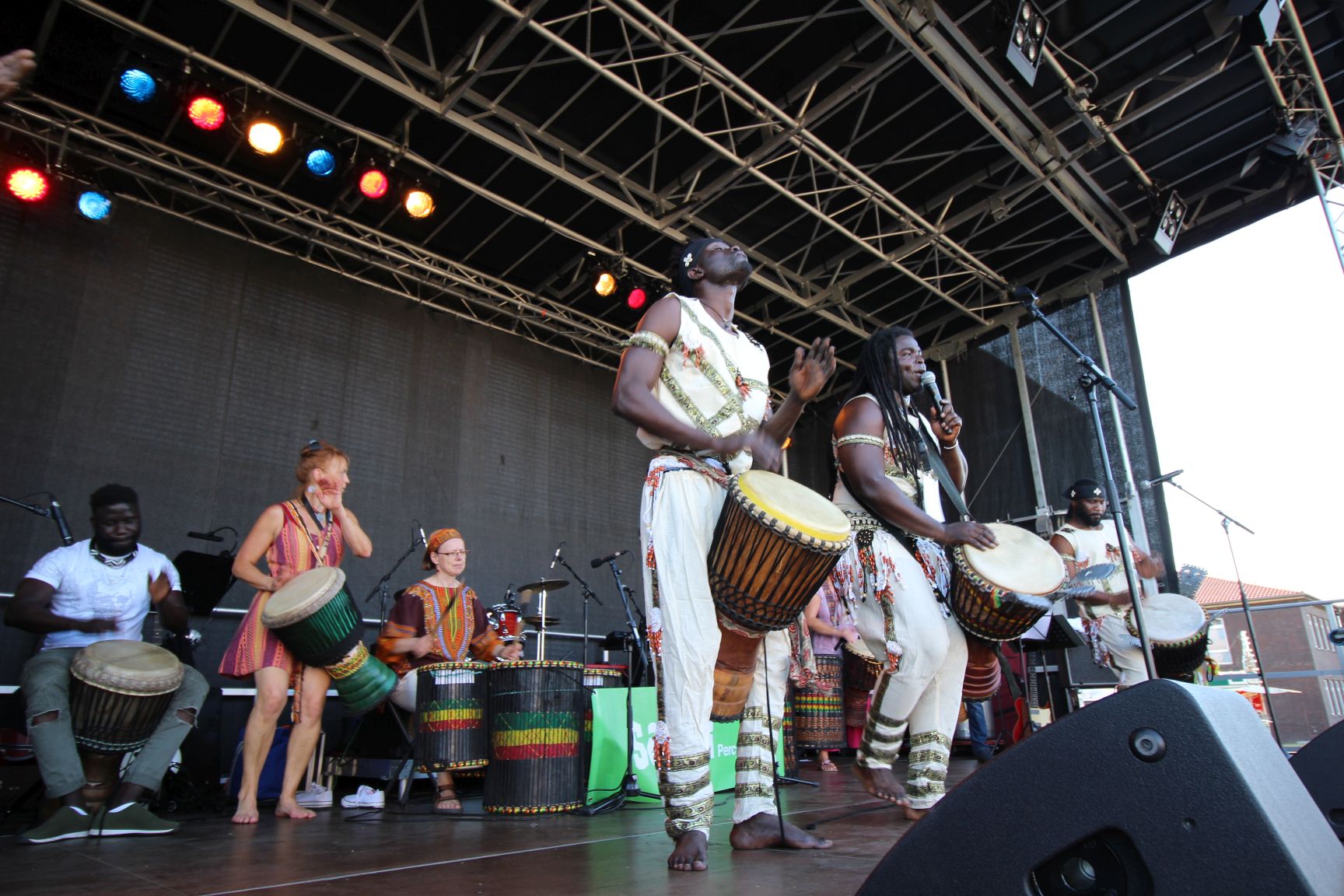 Während wir noch das tiefergelegte (öffentliche) und ebenfalls begrünte Parkdeck nebenan betrachten, startet auf der Bühne das Musikprogramm. Passend zum Wetter geht es mit afrikanischer Musik von Sapali Percussion los. Danach betreten die Physikanten mit einer kurzweiligen und unterhaltsamen Vorstellung die Bühne. Ihre Show trägt den Titel „Bang, Boom, Wow“. Vielleicht hätte der Moderator nicht verraten sollen, daß er das Publikum, also einige, genauer gesagt einen bestimmten mit in die Show einbauen wollte. In einem unbeobachteten Moment verschwand der Ausgesuchte nämlich eiligen Schrittes 🙂 .