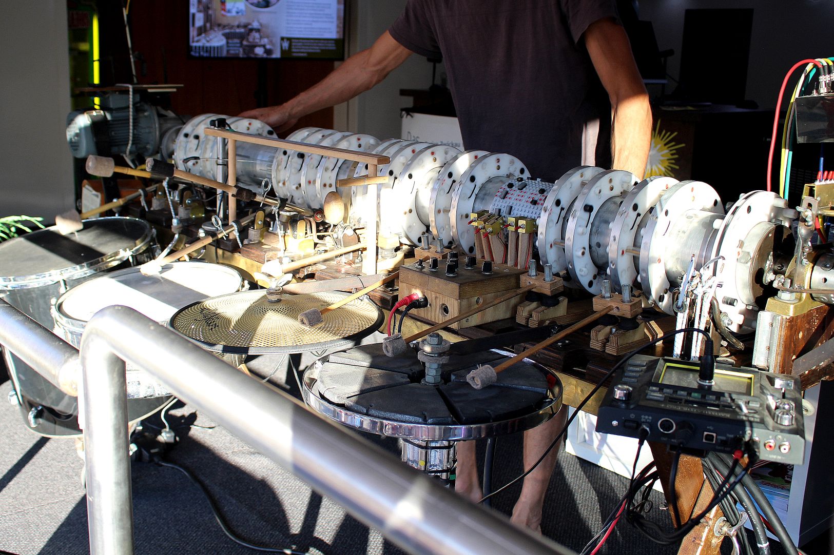 Auf dem Weg in Richtung Zeche blieb ich kurz am Truck des Bundeslandes Sachsen stehen. Neben Werbung für Industriekultur, sorgte Benny Hofer mit seiner Maschine dort für Aufsehen. Diese Maschine und ein passendes Drum Modul sorgten dafür, daß eine sich drehende Achse mit verschiedenen Scheiben Musik auf mehreren Schlagzeugen erzeugte. Eine geniale Maschine, die man zu spielen wissen muß. Googelt mal nach „Bam Bam – The Mechanical Sequenzer“ oder klickt mal hier.