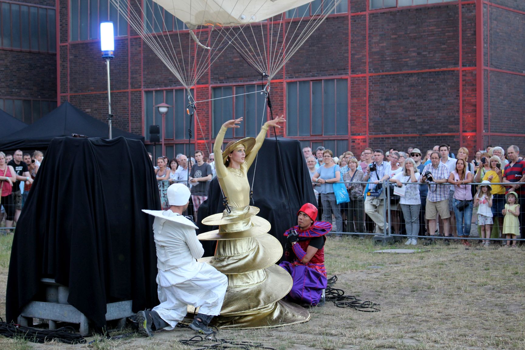 Zurück auf Zeche Zollverein, wußte ich gar nicht wo ich anfangen sollte. Die Kölner Band Kwaggawerk, die ich schon aus dem Vorjahr kannte, spielte fröhlich anarchische Musik, der Künstler Hikohki Gumo verstrickte sich und seinen Anzug in zwölf Haselstecken, Stelzenläufer präsentierten extravagante Mode im Baushausstil und auf dem Ehrenhof startete die Show Lufttanz. Hier hing die Künstlerin am Heliumballon, während dieser von zwei Helfern an jeweils einem langen Seil bewegt wurde. Die junge Dame interagierte unterdessen mit einem Flügelwesen auf gefederten Hochstelzen.