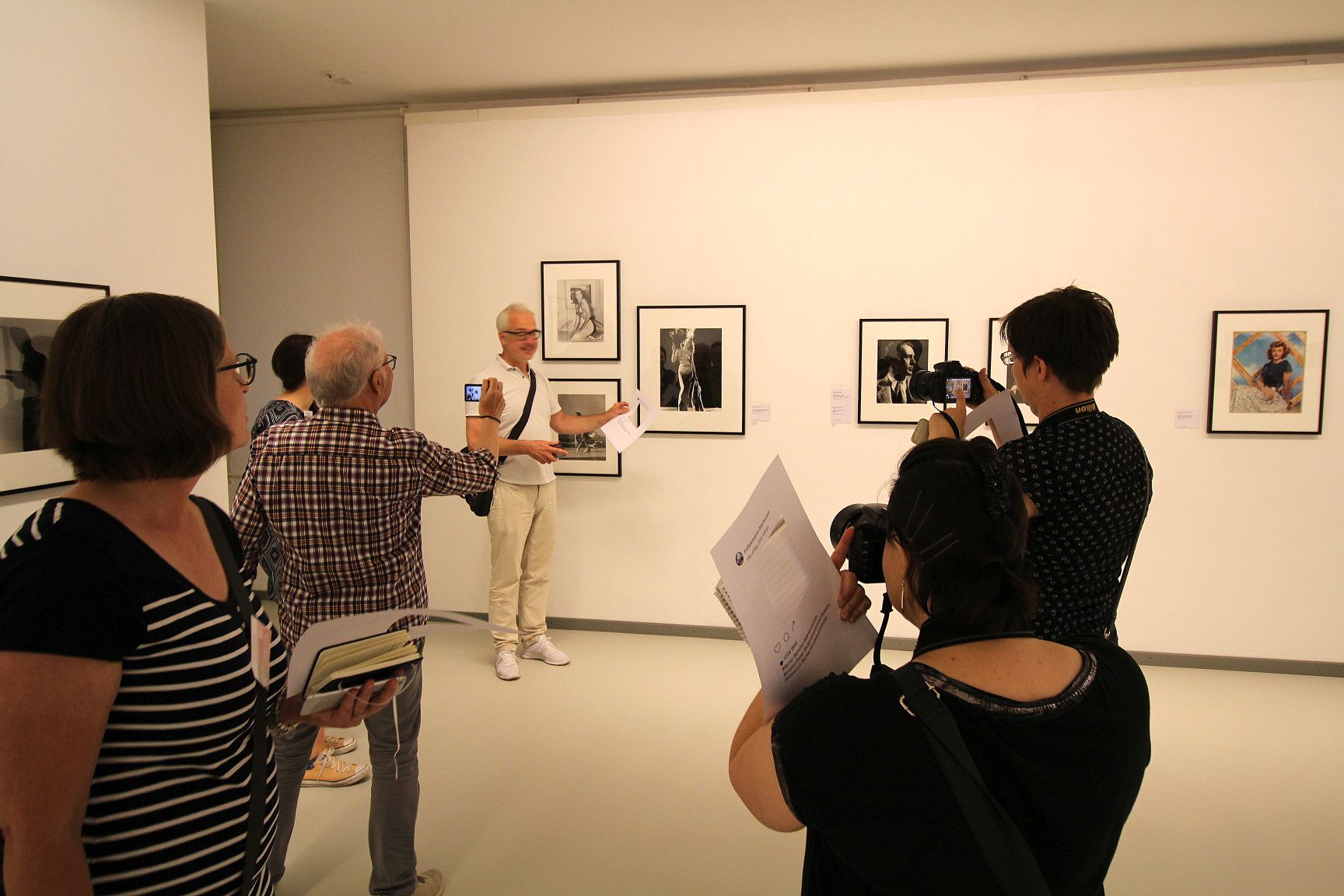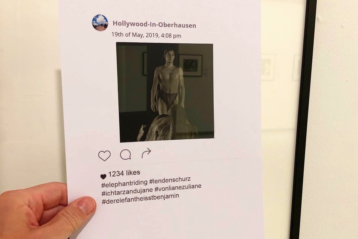 Während wir von Linda und Karoline durch die Ausstellung geleitet wurden, hieß es auf die Suche zu gehen, nach dem Bild, für das man selber „Pate“ stand. Ich hatte Johann Peter Weissmüller, besser bekannt als Johnny Weissmüller (Tarzan) gezogen. Bei den Hashtags #Elephantriding #Lendenschurz #IchTarzanduJane #VonLianezuLiane und #DerElefantheisstBenjamin ahnte ich ja schon wo der Hase … äh … Elefant läuft.
