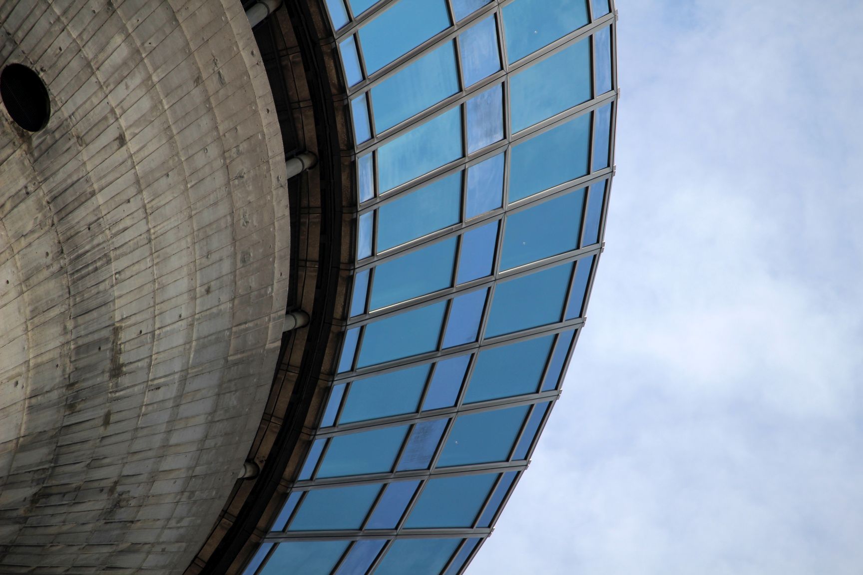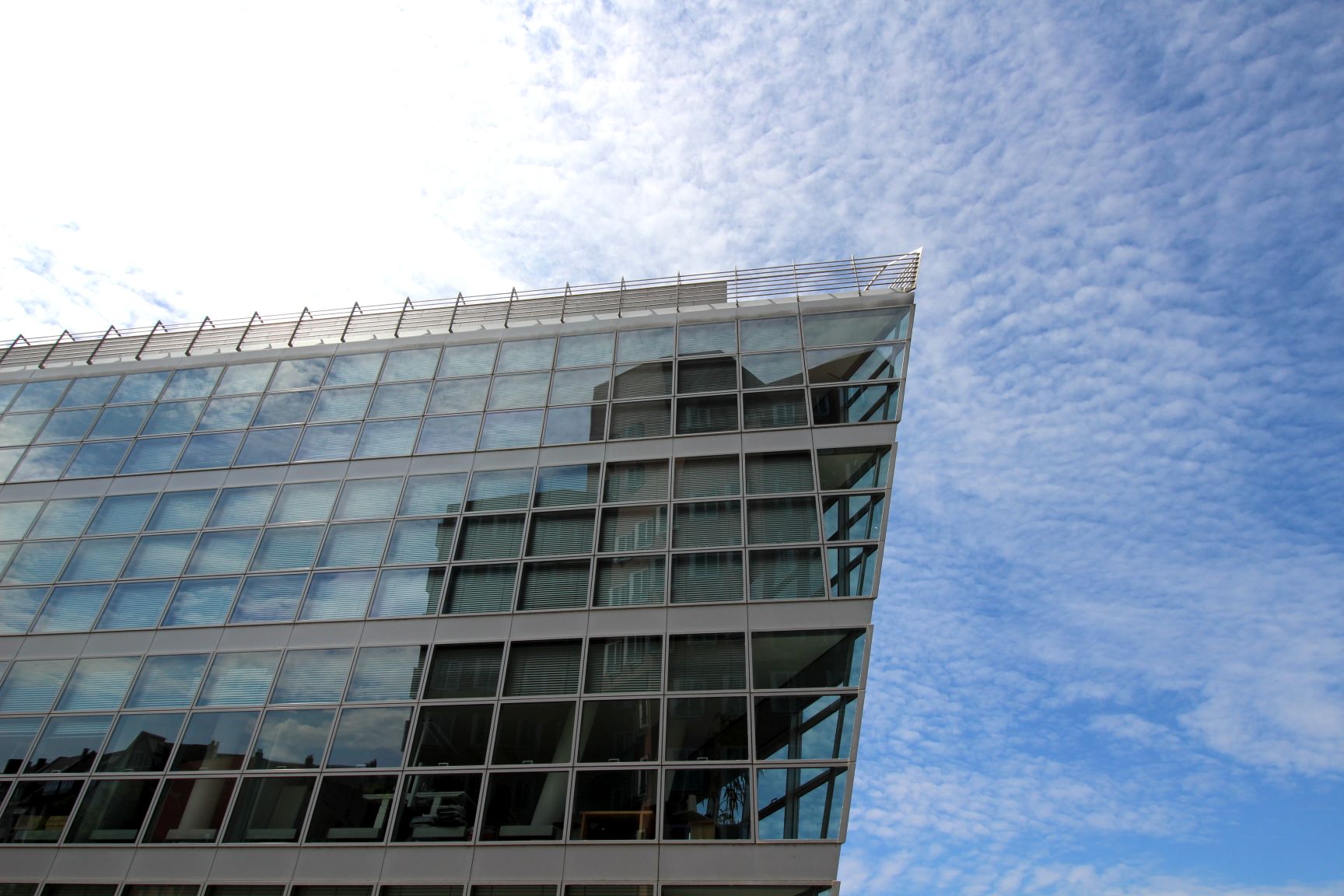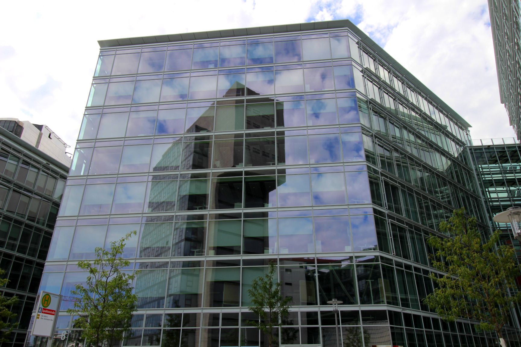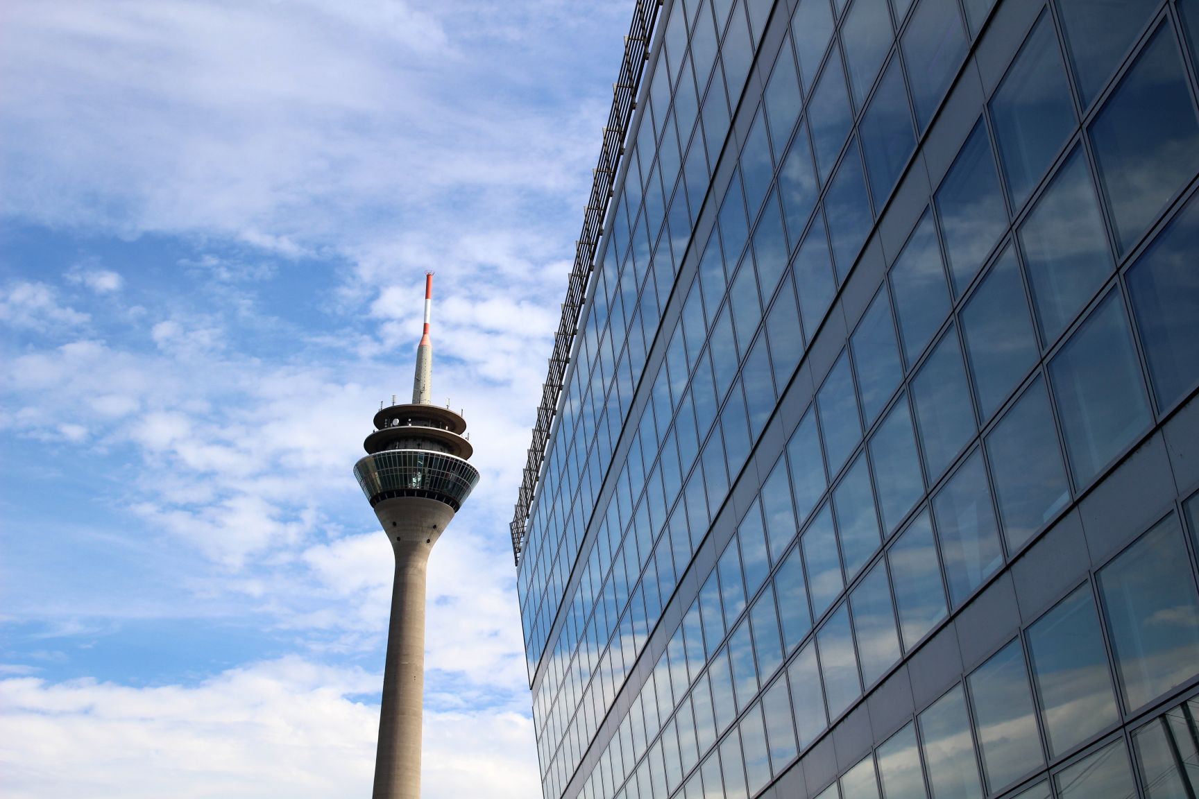 Der Himmel zeigte an dem Tag Sonne und Wolken, so daß sich in den Glasfassaden ein paar interessante Spiegelungen ergaben, das Hayatt Hotel hatte Kissen auf die Außentreppen gelegt, so daß man dort gemütlich sitzen konnte, nur die Open Air Bar hatte noch nicht geöffnet. Dieses Mal hatte ich neben dem Weitwinkel auch das Zoom Objektiv eingepackt, so daß ich die Aussichtsetage des Rheinturms auch mal von unten aus der Nähe betrachten konnte.