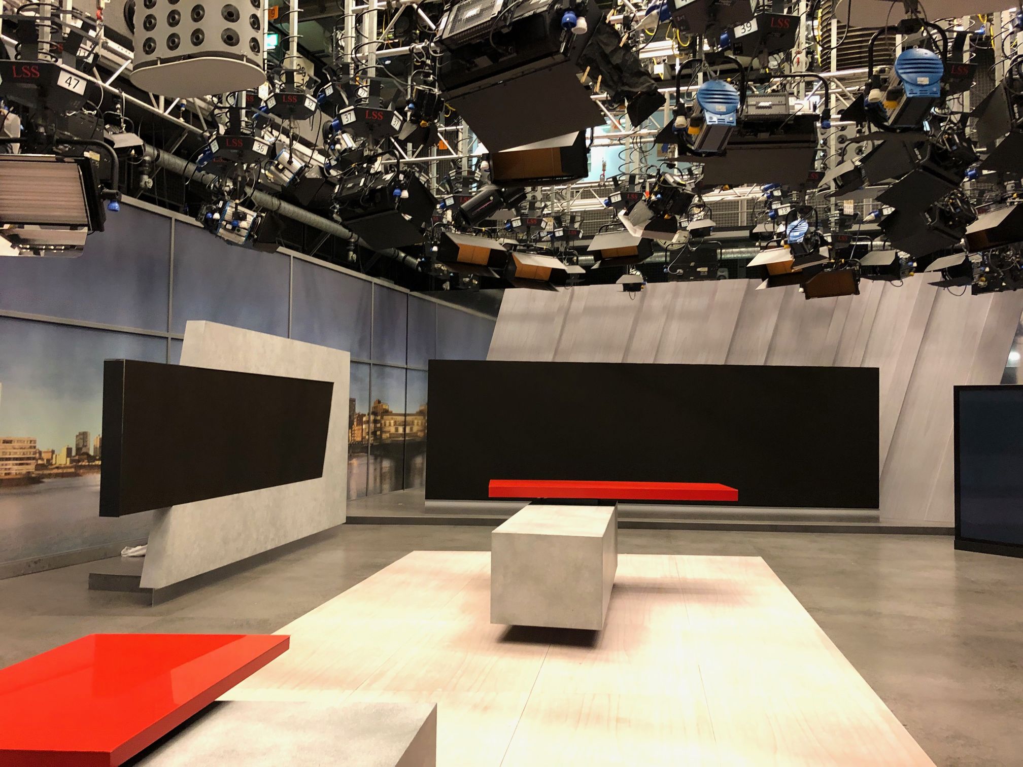 Der Techniker schaltete einen Teil der Beleuchtung ein, auf den eben noch schwarzen Leinwänden erscheint wie jeden Abend im Fernsehen die Kulisse Düsseldorfs, die Musik setzt ein … ooopss … ne Moment soweit ging’s dann doch nicht. 😉 Bevor eine Ausgabe von WDR Aktuell oder eben der Aktuellen Stunde komplett ist, ist noch einiges an Vorarbeit nötig.