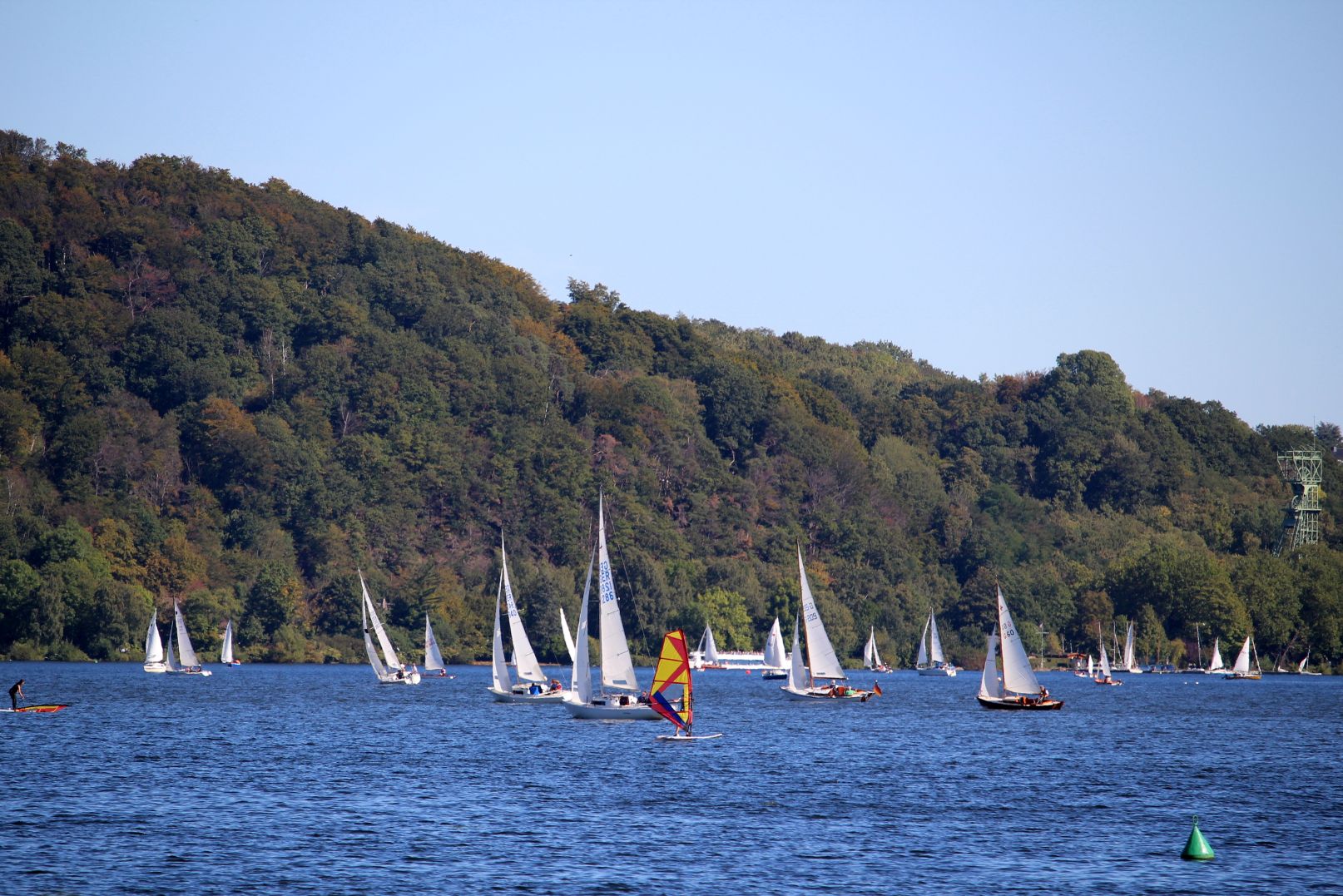 Der Baldeneysee in Essen war nochmal das Ziel und ich habe dort einfach (fast) nichts gemacht. 🙂 Ich bin einmal die Promenade vom Regattaturm bis zu den Tiroler Stuben und zurück, habe Enten und Fischreiher beobachtet, Segelbötchen fotografiert, rücklings auf einer der Bänke der Regattatribüne gelegen, in den strahlend blauen Himmel und auf tieffliegende Flugzeuge Richtung Düsseldorf geguckt. Nichts machen kann so schön sein.