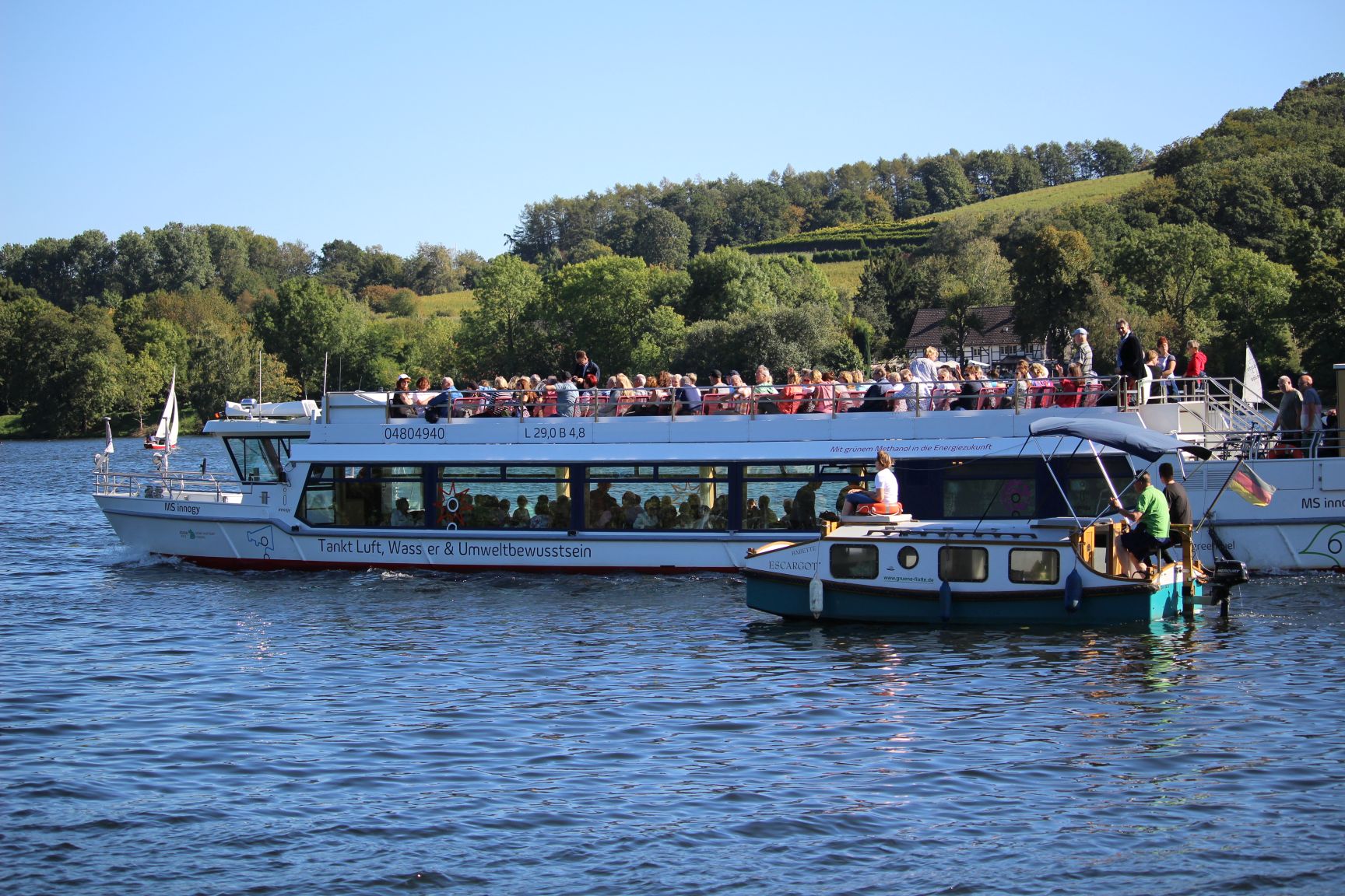 Dabei gab es eine Menge Zeitgenossen, die viel fleißiger waren als ich. Ruderer, Standup Paddler und Trethausbootfahrer (so ein Tretboot mit Kabine). Insbesondere letztere strampelten fleißig, wurden aber mühelos von der MS innogy (dem Methanol betriebenen Elektroschiff der Weißen Flotte) überholt. Ob das der Grund war? Ich weiß es nicht, jedenfalls warfen die Tretbootfahrer kurz darauf den Außenborder an. 🙂