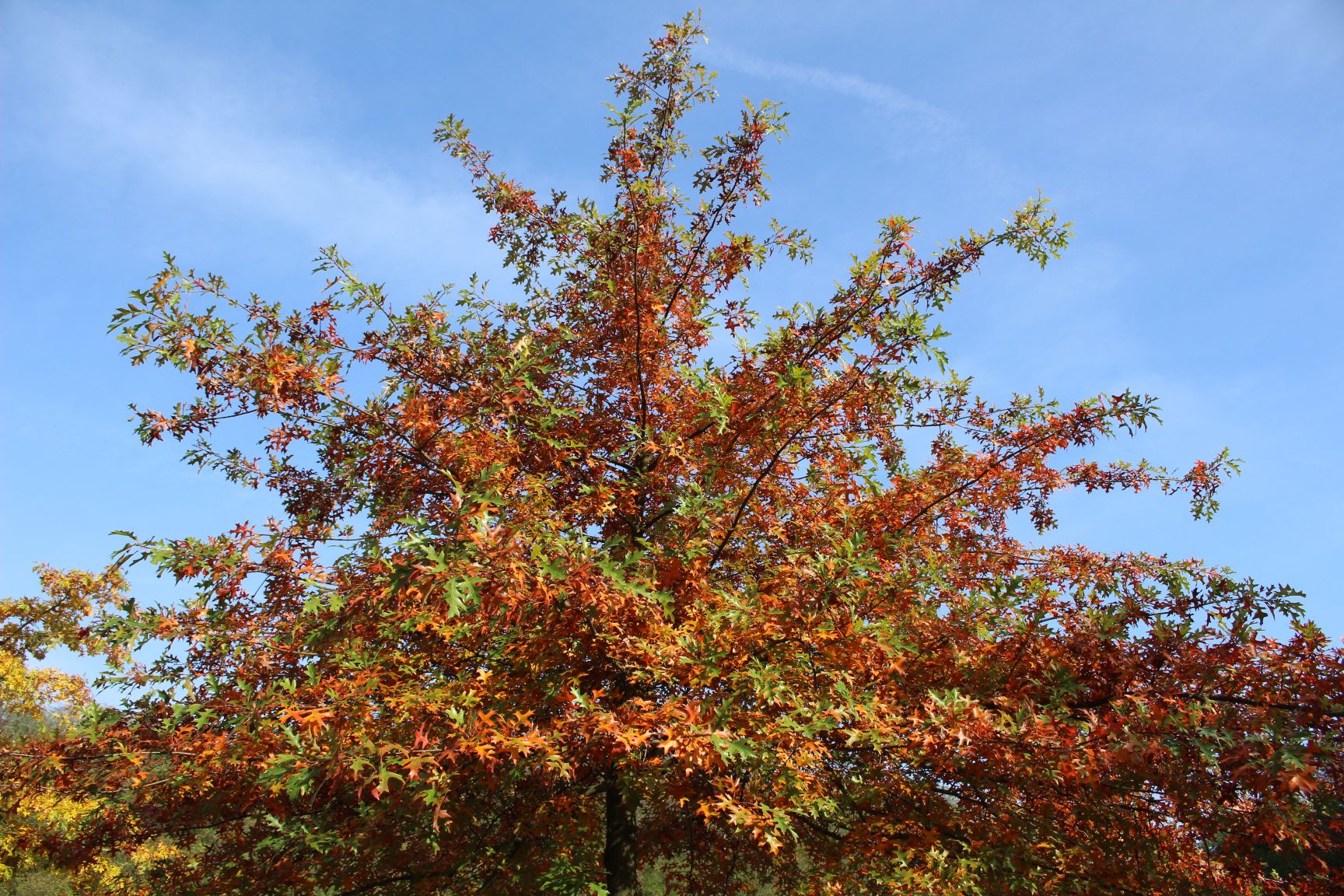 Ich stand vor einem stattlichen Baum an der Landstraße nach Krefeld. Eben noch satt grün, war die Blattfarbe des Sommers auf dem Rückzug. Für einen Moment genoß ich den Augenblick mitten auf der Straße, mit dem blauen Spätsommerhimmel im Hintergrund mußte ich einfach ein Foto machen. So wie hier, war ich in den letzten rd. 14 Tagen auf dem Weg den Herbst zu suchen. Startpunkt war das Fest „Essen erntet“ Anfang Oktober im Essener Grugapark.