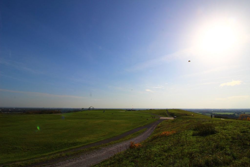 Ein ganzes Feld mit blühendem Gelbsenf, auch weißer Senf oder Ackersenf genannt. Die Pflanze überbrückt eine Zwischenphase und wird später wieder untergepflügt. Sie ähnelt vom Aussehen dem Raps und blüht wenn es im Herbst warm genug ist. Der sonnige Sonntag hat überraschend viele Menschen auf die Halde getrieben. So voll war der kleine Parkplatz selten.
