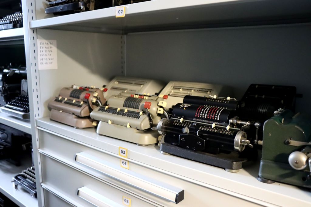 Wenn ihr etwas älter seit, wißt ihr vielleicht noch, daß eine Zeitung früher mit Hilfe eines Setzkastens „gesetzt“ wurde, vielleicht habt ihr auch mal eine Schreib- oder Rechenmaschine bedient oder kennt noch eine Dampfmaschine. Das eine oder andere davon findet sich im Depot des LVR wieder. Auf Grund unterschiedlich dicker Zwischendecken, können im Peter-Behrens-Bau in Parterre pro Quadratmeter 5000 kg Gewicht gelagert werden.