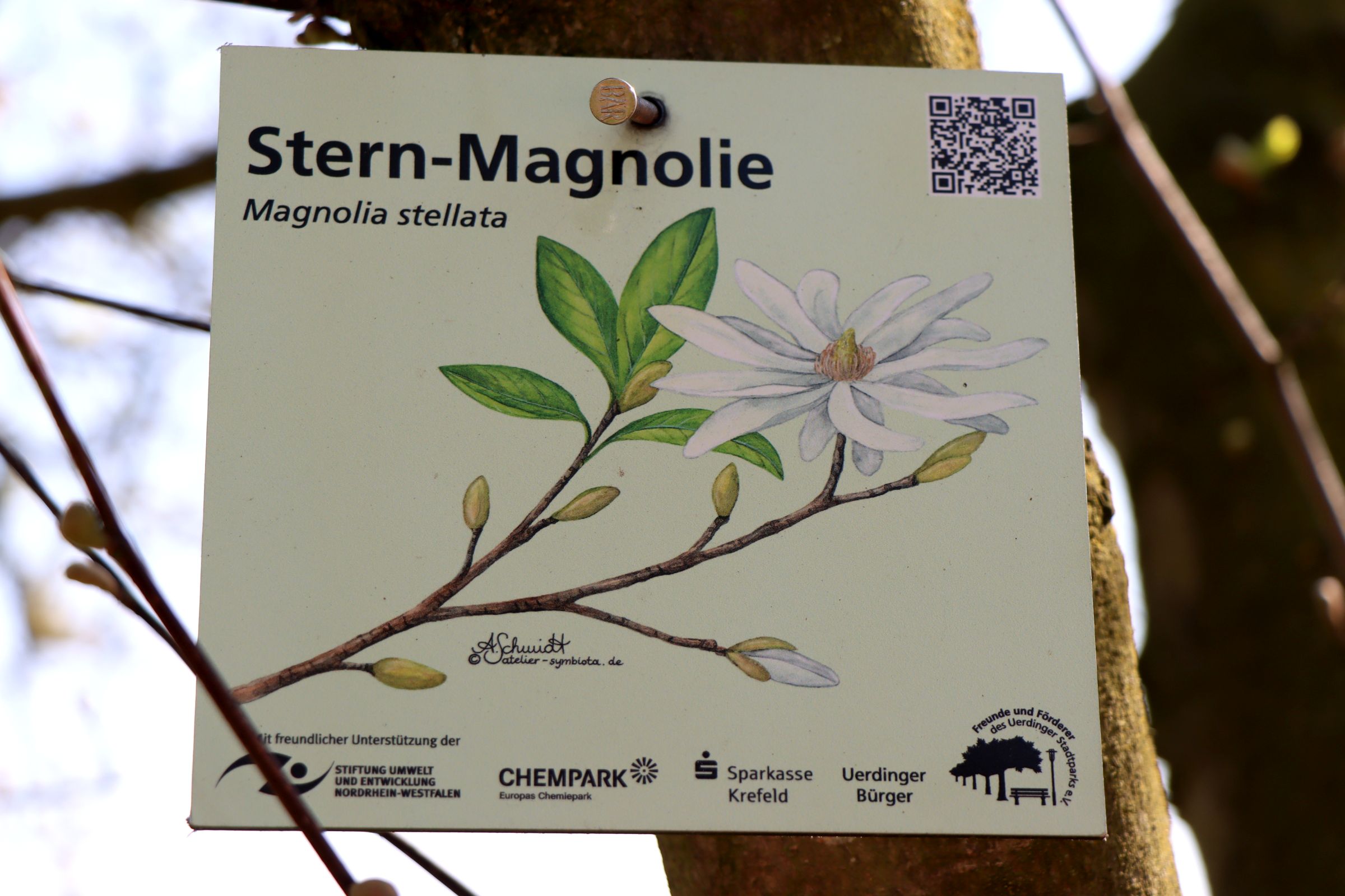 Den dort ausgehängten Plan gibt’s wohl auch in handlicher Form beim Minigolf, aber auch der hat ja zur Zeit geschlossen. 64 Bäume finde ich im Arboretum vom Feuer Ahorn über den Götter- bis zum Schnurbaum. Verschiedene Magnolienarten, Birne, Apfel oder die Kaukasische Flügelnuß. Schaut doch einfach selber mal auf die Liste. Jeder Baum hat ein kleines Schildchen mit seinem Namen und einem QRCode, der auf die Seite des Uerdinger Stadtparks verweist.
