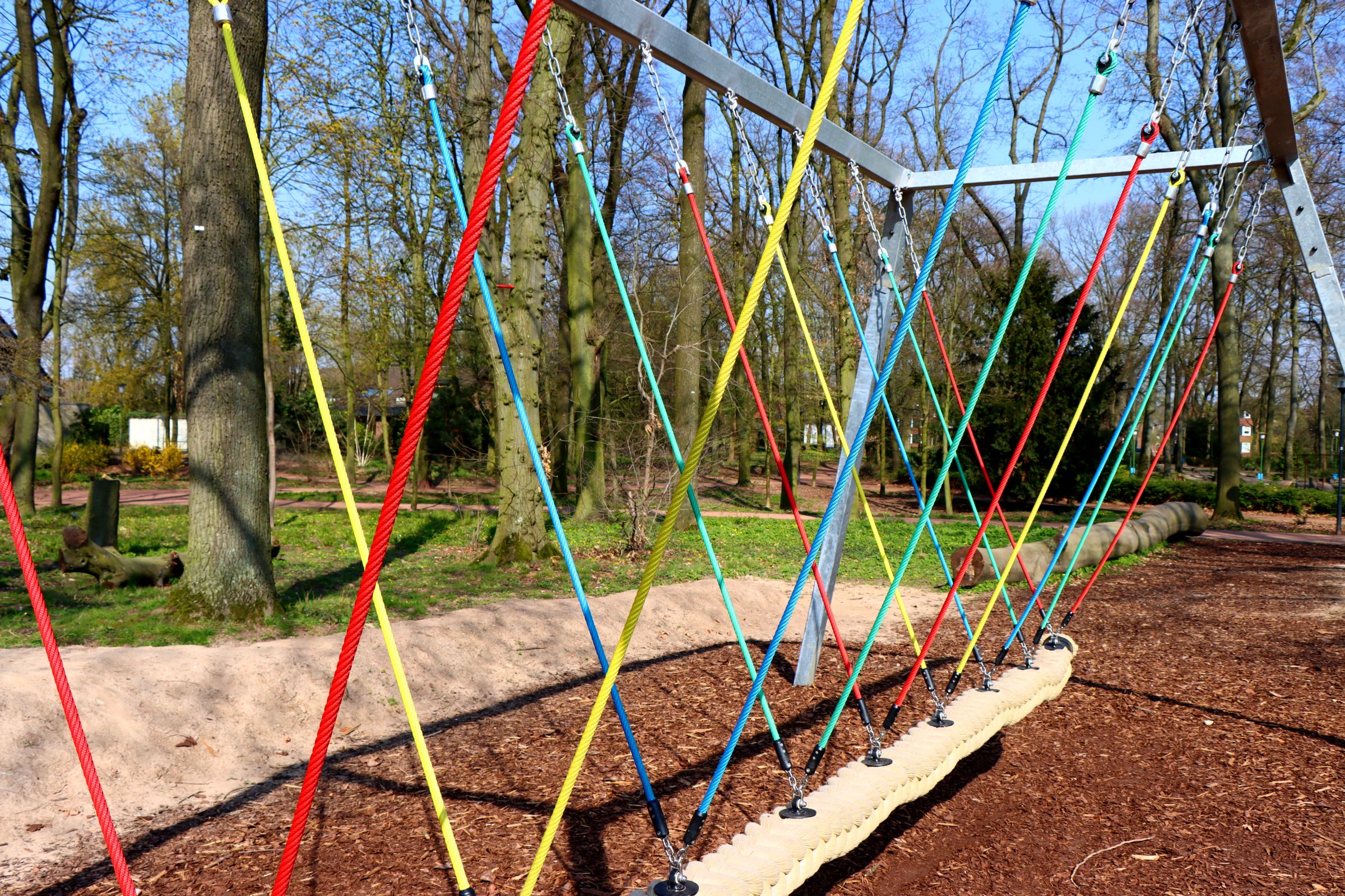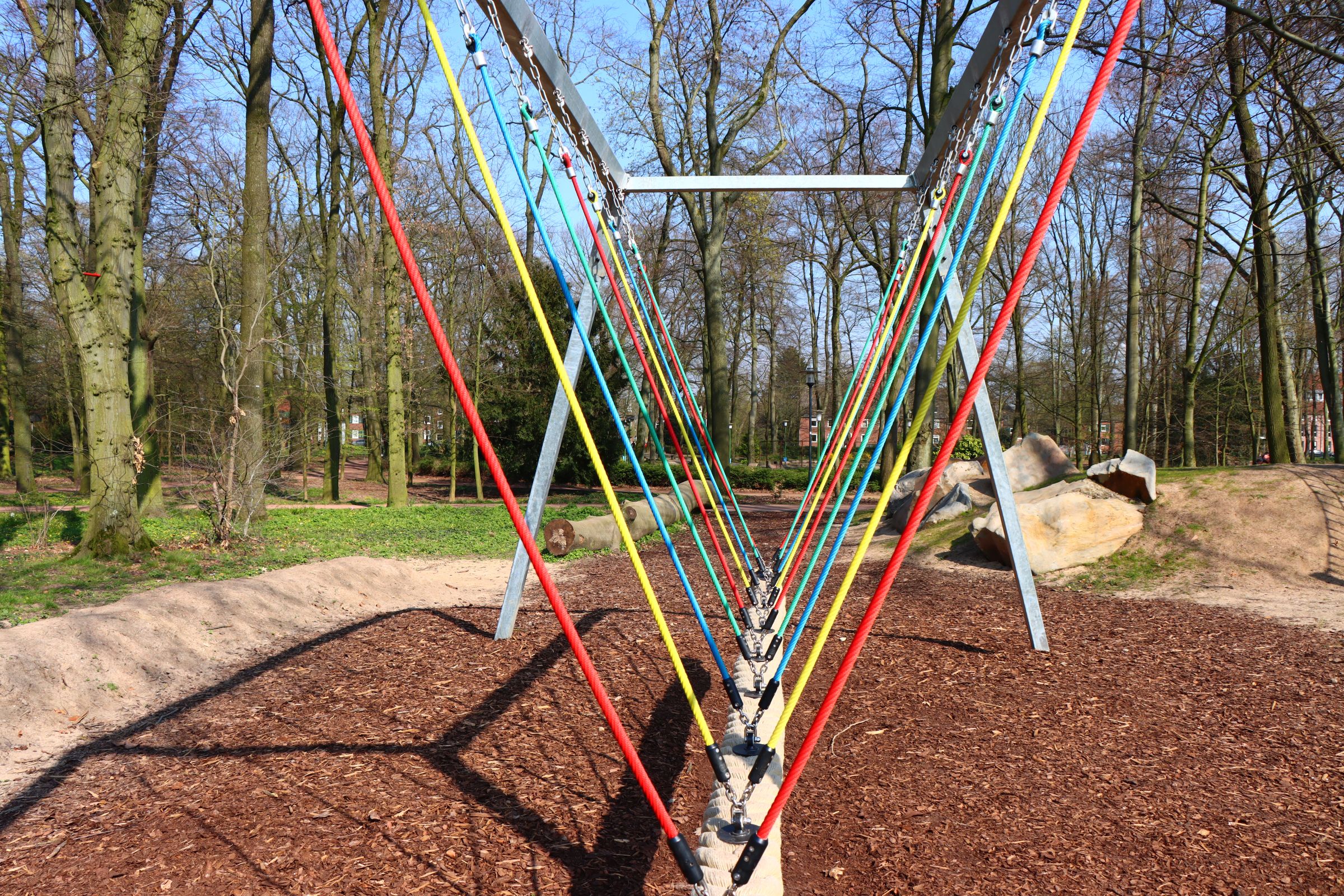 Als erstes entdecke ich den großen (Abenteuer-) Spielplatz, der auf Grund der aktuellen Umstände allerdings verwaist ist. Nur auf der Wiese spielen ein paar Väter mit ihren Söhnen Fußball. Die Sperrung des Spielplatzes gibt mir dafür die Möglichkeit ein Foto der nagelneuen Tampenschaukel zu machen. Ich biege, von der Parkstraße kommend, nun aber nach rechts in den Park ab und nur wenige Meter später stehe ich vor einer großen Hinweistafel (siehe oben).