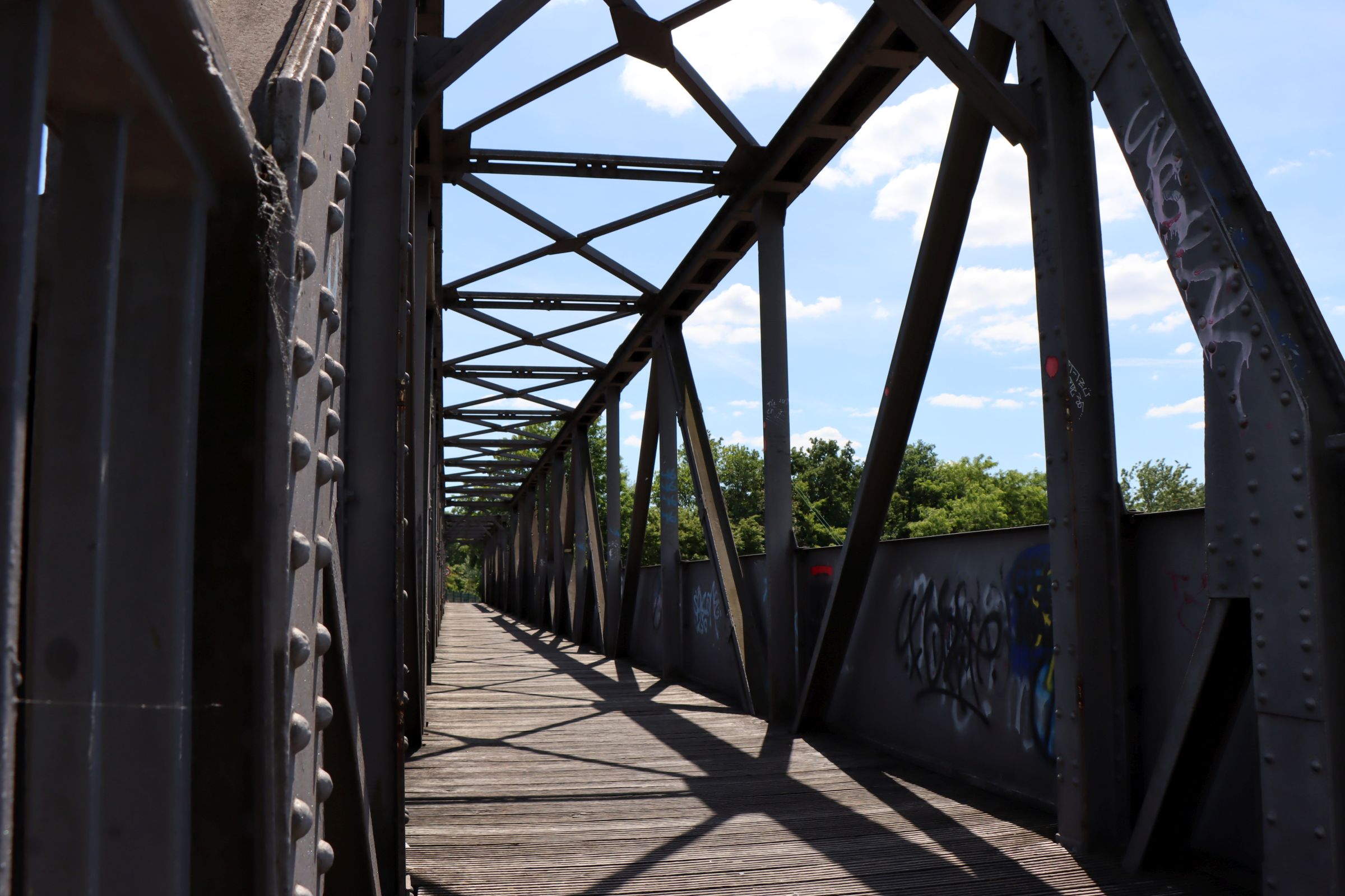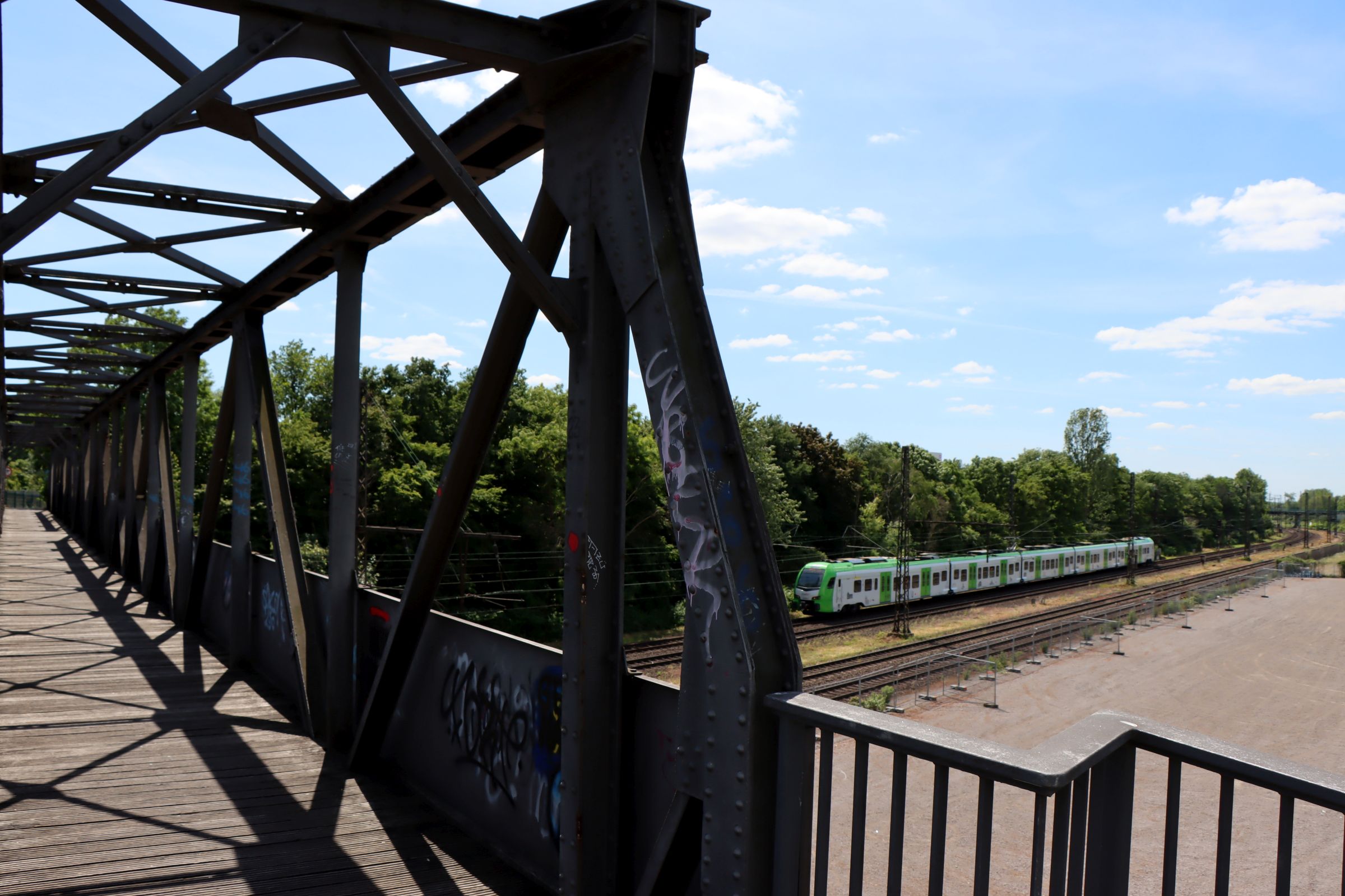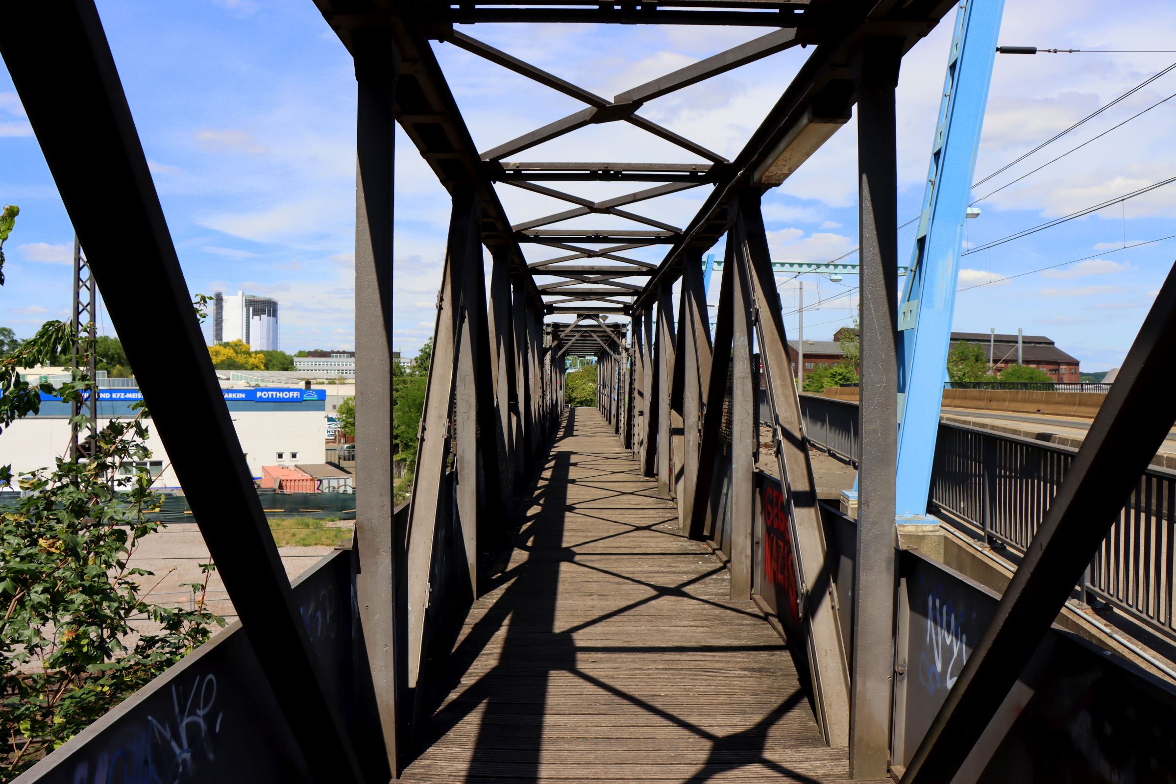 Aber das wollte ich gar nicht erzählen, die Brücke um die es hier geht, ist ein paar hundert Meter südlich, ebenfalls neben der ÖPNV Trasse. Die Brücke hat sogar einen Namen, nämlich „Henkelmannbrücke“. Der Name hat mich neugierig gemacht. Sie ist nur 58 Meter lang und verband früher das Industriegelände des Hüttenwerks mit den Arbeiterquartieren an der Brücktorstraße in Oberhausen.