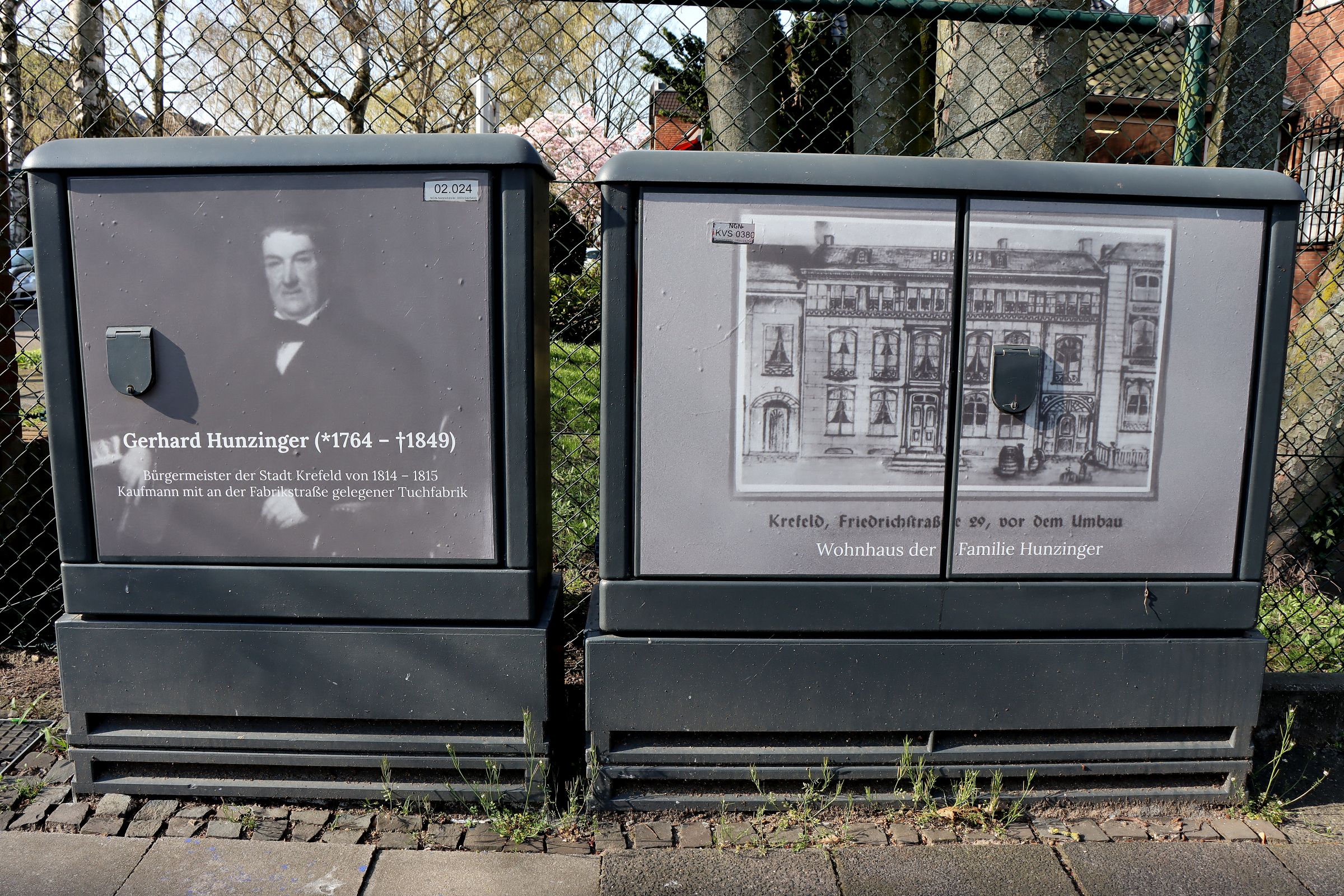 Ebenso nicht, warum die Jentgesallee so heißt wie sie heißt. Allerdings mußte ich hier etwas recherchieren. Wilhelm Jentges war der Sohn eines Seidenfabrikanten, Unternehmer, Komunalpolitiker und 1858 Stadtverordneter in Krefeld. Zum guten Schluß habe ich noch den Verteilerkasten mit dem Namen Hunziger gefunden. Hunziger … hat die nicht mal Wetten daß … moderiert. Ach ne, ein gewisser Gerhard Hunziger (auf gleichnamiger Straße, deren Namen ich nicht einmal kannte) war Unternehmer, Tuchfabrikant und Weinhändler und ein gutes Jahr lang (1814-1815) Bürgermeister der Stadt Krefeld.