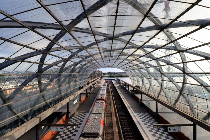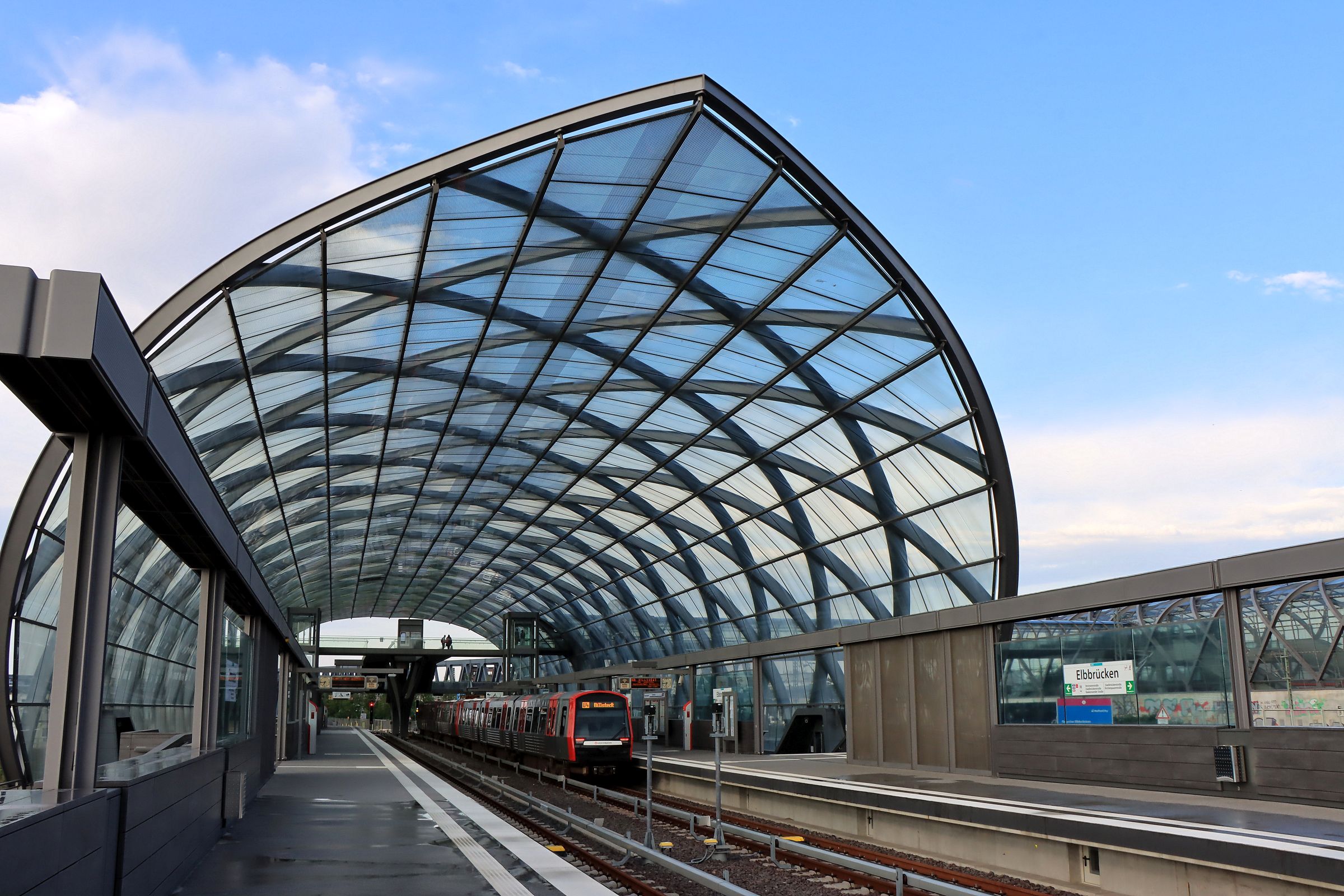 Während ich kurz darauf eine Straßenecke weiter unter einem Baum stehe, verdächtiges Rauschen. Es hat angefangen zu regnen. Also ab in die U-Bahn und zurück in die Hafencity. Jetzt fahre ich mit der U4 bis zur Station Elbbrücken. Diese Station wurde im Dezember 2019 eröffnet und bietet einen Umstieg auf die S-Bahn in Richtung Süden und natürlich Richtung Hauptbahnhof. U- und S-Bahn haben das gleiche geschwungene und fotogene Dach und zwischendrin gibt es einen gläsernen Verbindungsgang dessen Eingang mit „The Gate“ betitelt ist. Ich muß da unbedingt nochmal abends hin.