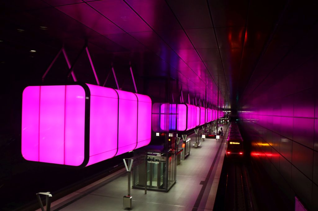 Stattdessen flitze ich als es dunkel wird, vom Hotel nochmal kurz rüber auf die andere Seite des Baakenhafens. Hier legen nicht nur die Kreuzfahrtschiffe an, sondern hier steht auch das Lighthouse Zero auf der Spitze des Baakenhöfts. Kein altes Industriegebäude, wie ich erstmals dachte, sonden ein Wohnerlebnis mit 360° Panorama-Aussicht und im dunkeln beleuchtet wie ein Ufo. Auch die U4 Station „HafenCity Universität“ ist einen Halt wert. Bunte Kuben wechseln hier in regelmäßigen Abständen ihre Farbe und tauchen die 10 Meter hohe Bahnsteighalle (16,5 Meter unter Geländeniveau) in immer wieder neue Farben. Ich liebe das.