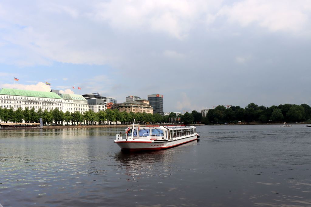 Auf Grund eines Regenschauers wurde das Cabrio Boot sicherheitshalber gegen eines mit Dach getauscht, dann konnte es losgehen. Unter der Lombards- und Kennedybrücke hindurch geht es vom Jungfernstieg raus auf die Außenalster. Das Ticket kostet normalerweise 16,50 € (Stand Juli 2021) und die Fahrt dauert eine Stunde. Diese Fahrt wurde mir von Hamburg Tourismus zur Verfügung gestellt. Wusstet ihr, daß die Außenalster so groß wie Monaco ist und daß es nur ganz wenige private Grundstücke gibt, die bis ans Wasser reichen? Die sind dann auch etwas teurer mit 12.000,- € pro Quadratmeter versteht sich. Sogar das kleine „Weiße Haus“ der amerikanischen Botschaft gibt es an der Alster und wer doch lieber laufen möchte, eine Runde um die Außenalster sind 7,4 km.