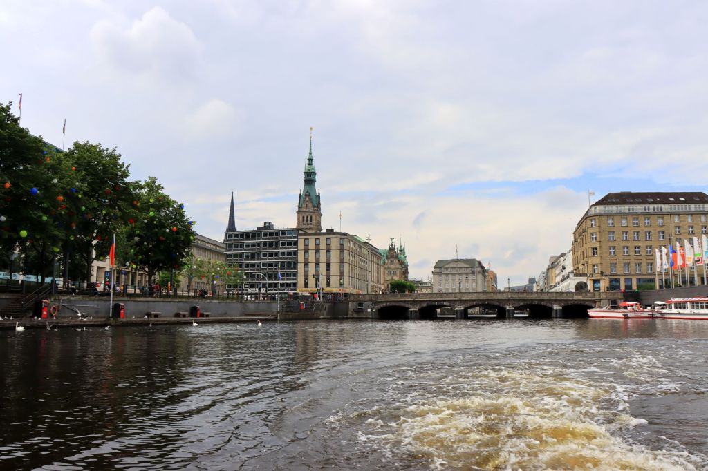 Den Dienstag wollte ich in aller Ruhe angehen lassen. Ich starte ich mit einem Frühstück im Hotel und begebe mich dann nochmal in Richtung Baakenhöft. Hier befinden sich seit wenigen Wochen die ersten Supermärkte der südlichen Hafencity und der Baakenpark mit Aussichtspunkt. Bevor die ersten Bewohner einziehen, sind die ersten Grünflächen immer schon da. Ich erklimme den sogenannten Himmelsberg und staune über das Kräneballett. Zurück an der U4 geht’s nun Richtung Jungfernstieg und von da aufs Wasser. Eine Alsterrundfahrt soll es heute sein. Verrückt, aber die habe ich in der Tat noch nie gemacht (oder es ist schon zu lange her), dabei liegt es doch so nahe. Es geht einmal in Ufernähe um die Außenalster.