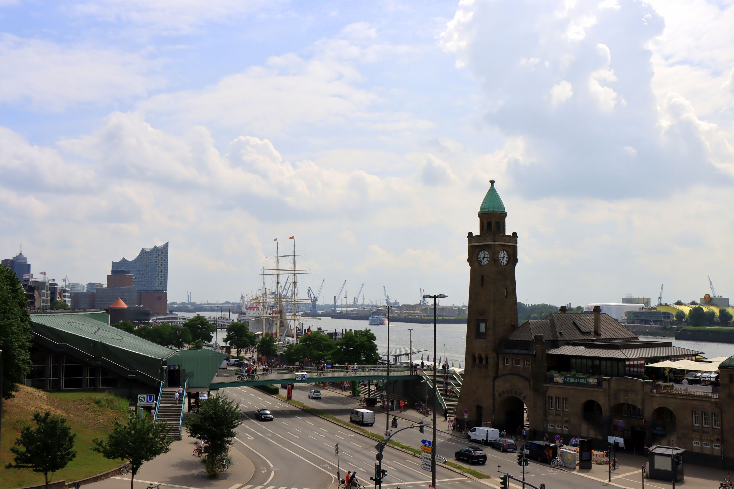 Von der Alster geht es jetzt an die Elbe. Hinter den Landungsbrücken gibt es, etwas oberhalb der Straße, einen schönen Aussichtspunkt. Da der Sintfang, direkt auf der U-/S-Bahn Station der Landungsbrücken, umgebaut und renoviert wird, bin ich 100 m weiter gelaufen. Auf der anderen Seite der Straßenkreuzung geht es eine Treppe hoch und man erhält einen tollen Ausblick auf die Landungsbrücken, die Rickmer Rickmers bis hin zur Elbphilharmonie. Gerne hätte der Himmel etwas blauer sein dürfen.