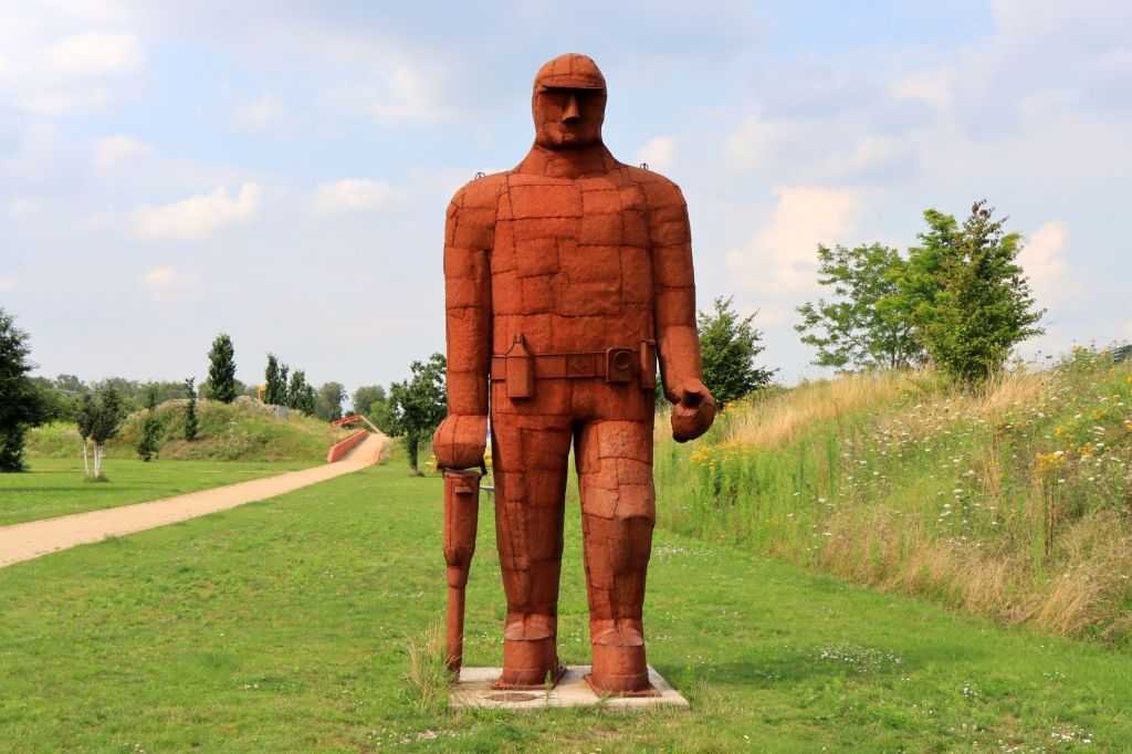 Das einzige was auffällt ist die 4,40 Meter hohe Skulptur eines Bergmanns, der beiden Künstler Anatol Herzfeld und Frank Merks. Sie besteht aus Cortenstahl, also eine spezielle Stahlart, die besonders unempfindlich und wetterfest ist. Die Skulptur soll auf die wichtige Epoche des Bergbaus in Neukirchen-Vluyn hinweisen. Weitere Bilder bei bei Flickr und Google Photos.