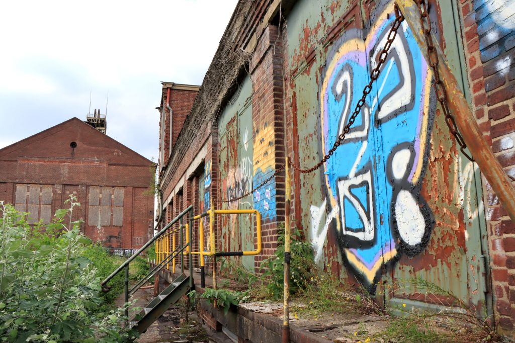 Zu meiner Überraschung waren die Zäune mittlerweile entfernt, eine Straße gebaut und Parkplätze entlang der Straße angelegt. Viel los war, außer auf dem nahegelgenen Skaterplatz, allerdings nicht. Der Müll auf der Straße ließ darauf schließen, daß diese als Treffpunkt für wen auch immer dient. Für Fotos kommt man dafür ziemlich nah ran an die alten Fördergerüste. Das einzige Gebäude, das noch in Betrieb schien, ist das Grubenwehrhaus (Altes Lüftergebäude), in dem sich ein kleines Heizwerk befindet.
