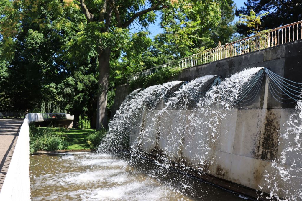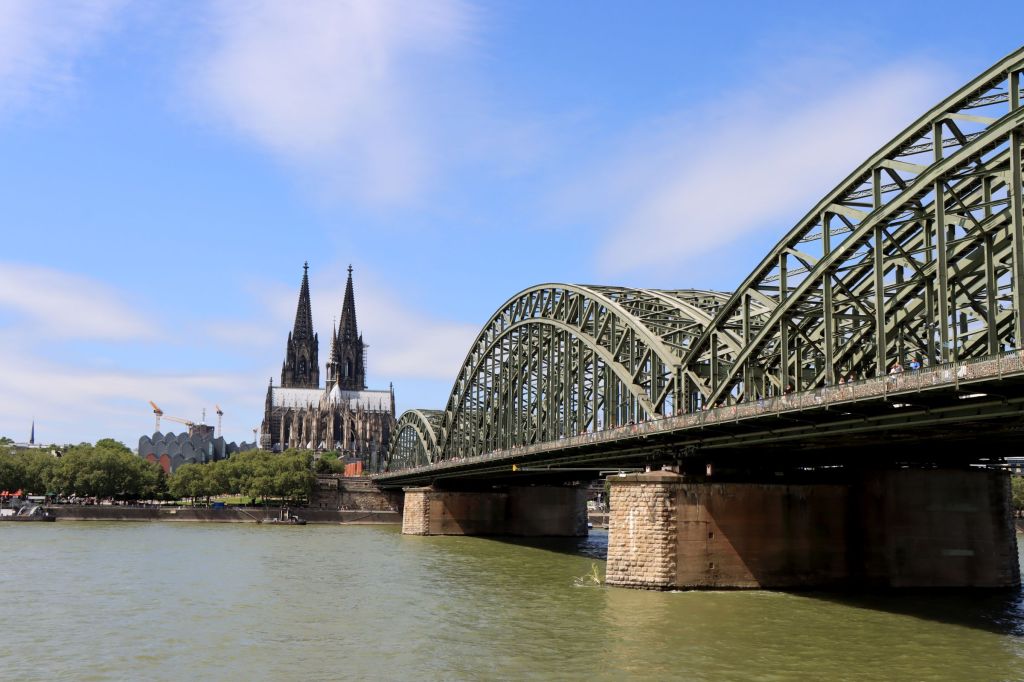 Zurück an der Zoobrücke ging es dann gemütlich zu Fuß durch den Rheinpark in Richtung Hohenzollernbrücke. Auch dort hätte es noch zwei Kunstwerke gegeben, aber ich war im Geiste schon auf der Aussichtsplattform des Triangle Turms, den ich 2017 schon mal besucht hatte. Leider hatte sich vor der Türe eine recht lang Warteschlange gebildet, so daß ich doch vom Besuch Abstand genommen habe. Ich habe mich stattdessen ein paar Meter weiter auf dem Rheinboulevard zu einer kleinen Pause niedergelassen und von dort das Altstadtpanorama genossen.