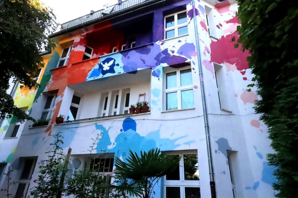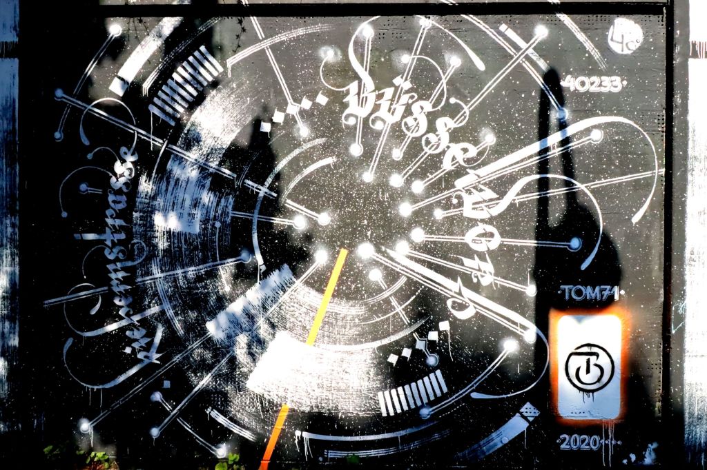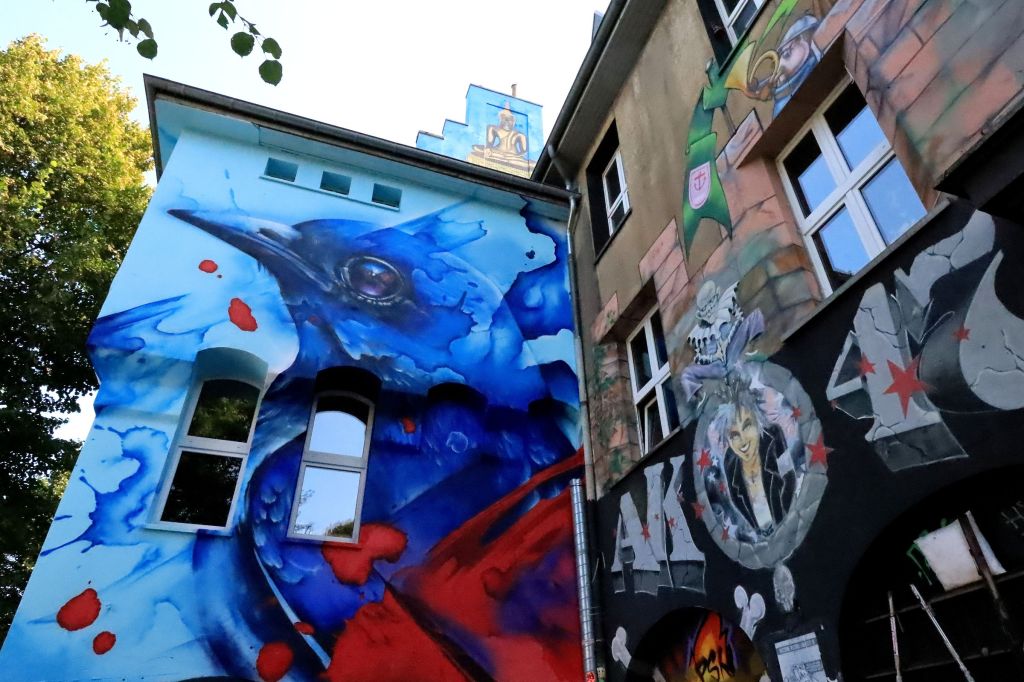 Nun feiert die Straße dieses Jahr ihr 40-jähriges Jubiläum und die Fassade Kiefernstraße 25 (Titelbild) sowie einige Lärmschutzwände wurden neu gestaltet. Aber nicht nur dort sondern auch im Umfeld, so z.B. an der Werdener Straße (B8 Center), an der Mettmanner Str. 102 und am Höher Weg 12. Großflächige Arbeiten, die ein paar Tage in Anspruch genommen haben, so daß noch nicht alles fertig war. Aber auch in der Kiefernstraße selbst waren einige Kunstwerke, die ich noch nicht kannte. Informationen über die 40Grad Künstler (2021) findet ihr hier, weitere Bilder in den Düsseldorfer Alben von Flickr und GooglePhotos.