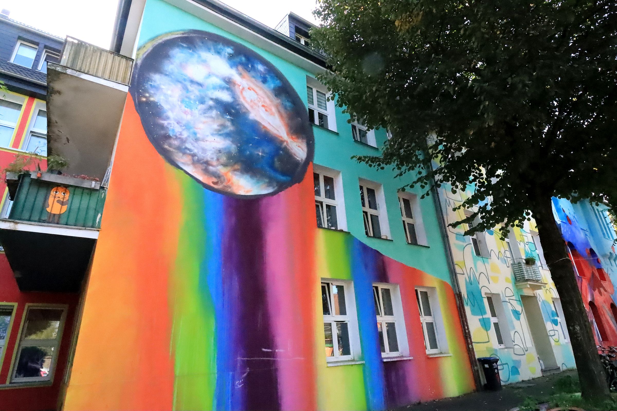 Als ich vor einigen Jahren das erste Mal auf der Kiefernstraße war, war mir die Geschichte der Straße nicht bewußt. In den 1980er Jahren wurde sie durch Hausbesetzungen bekannt, Mitte der 1980er Jahre wurde die Straße zudem in Verbindung mit der RAF gebracht. Heute leben die ehemaligen Hausbesetzer in regulären Mietverhältnissen [Wikipedia]. Selbst wenn ihr noch nicht dort gewesen seid, habt ihr sicher schon mal Bilder gesehen. Die Fassaden der Häuser wurden auf einer Länge von rd. 200 Metern im Streetart-Stil gestaltet.