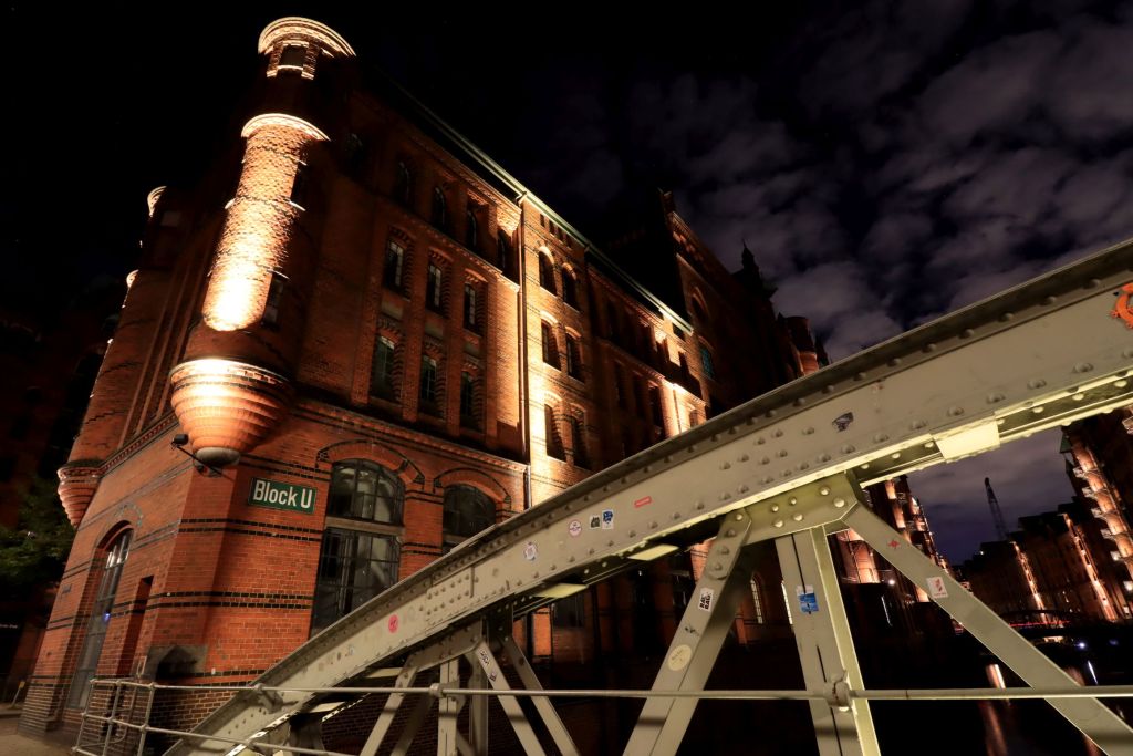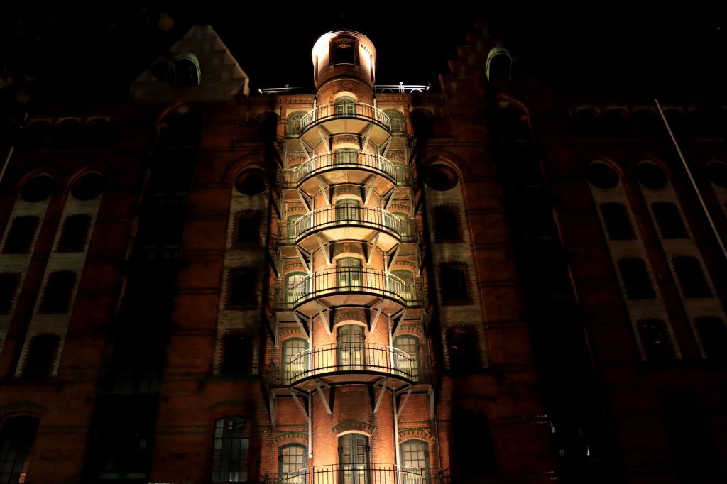 Nach einem kleinen Snack im Hotelzimmer ging es dann mit dem Stativ unter dem Arm zu ein paar Aufnahmen im Dunkeln. Chilehaus, Sprinkenhof und Speicherstadt incl. Stadtschlösschen und die U-Bahnstation Elbbrücken waren mein Ziel. Apropos Stadtschlösschen, vielleicht haben einige eine falsche Vorstellung, denn zwischendurch fragte mich jemand, wo denn das Stadtschlösschen sei. Zugegeben, es stehen ein paar Bäume davor, aber wir standen nur 20 Meter entfernt. Ich zeigte auf das Gebäude vor uns und sagte das, genau das da ist es und erntete überaschte Blicke. Danach wandte ich mich wieder meinen Bildern zu.