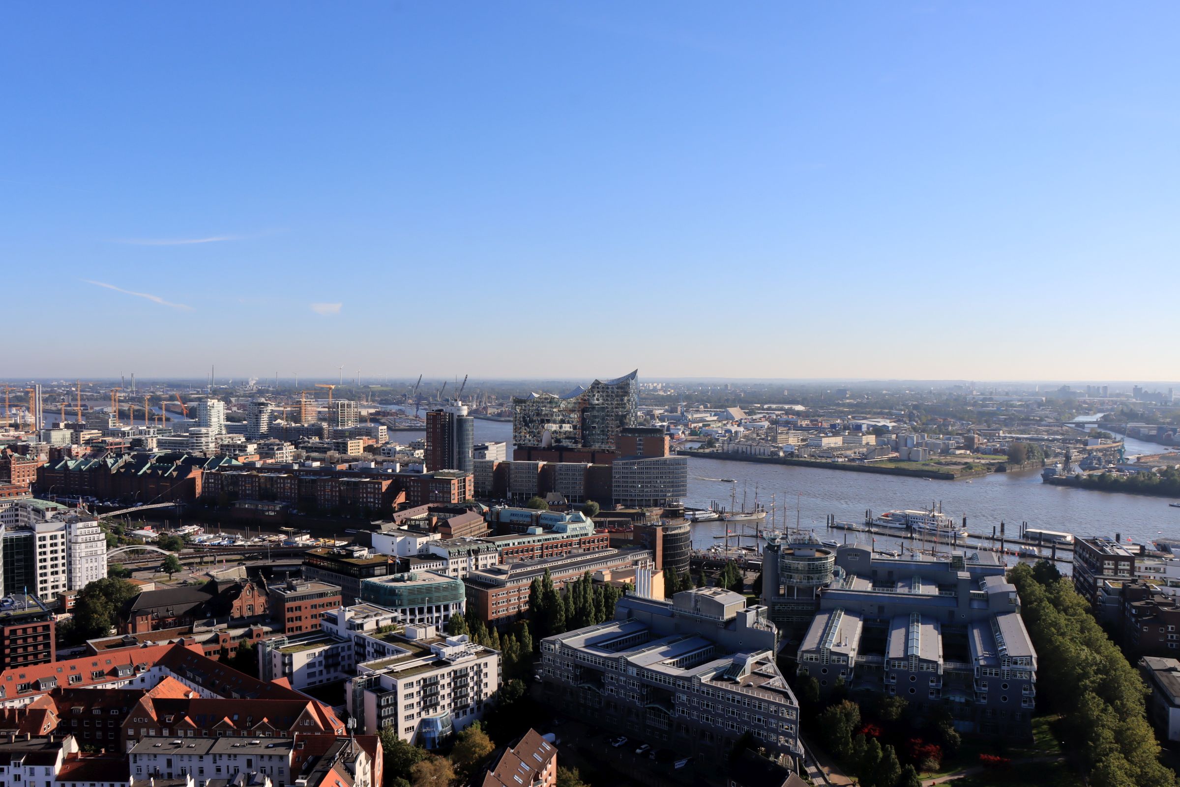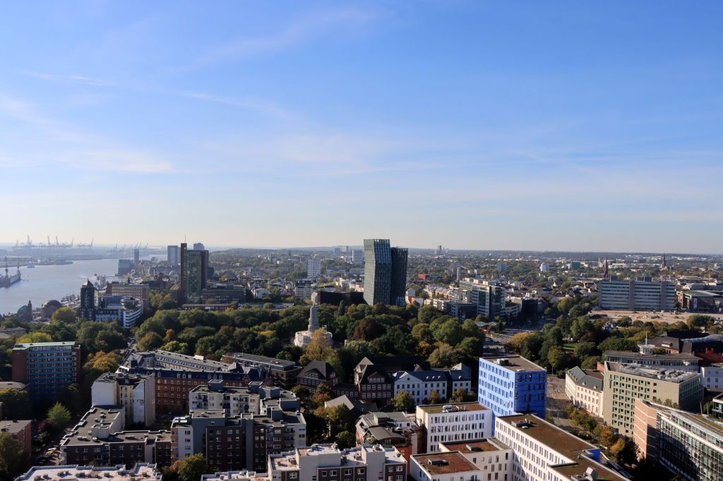 Nach einem Abstecher in den nächsten Supermarkt waren es nur noch wenige Schritte bis zum Michel. Der letzte Besuch auf der Aussichtsetage ist auch schon wieder einige Jahre her, sollte ich vielleicht …? Ja, kurz entschlossen habe ich mich in die Warteschlange vor dem Kirchprotal eingereiht. Draußen gings recht flott, drinnen stockte dann der Besucherstrom etwas vor dem Aufzug, mit dem es nach oben geht. Aber ich hatte ja Zeit und nach einer guten Viertelstunde stand ich oben auf der Aussichtsetage. Hier gibt’s übrigens eine Webcam mit Livebild.