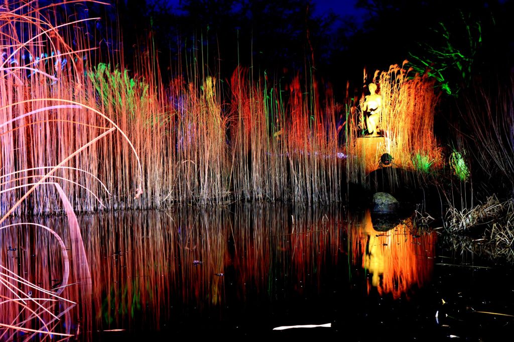 Auf den leuchtenden Rucksack werde ich im Laufe des Abends noch öfter angesprochen und verweise dann jedes mal auf das „Festival of lights“. Erst zu Hause sehe ich, daß der Rucksack dort mittlerweile ausverkauft ist. Trotzdem Interesse? Dann sucht mal nach „nebulite berlin“. Jetzt aber genug der unbezahlten Werbung. Auf den Hauptwegen ist es verhältnismäßig voll, aber wenn man, als Kenner der Gruga, mal den einen oder anderen Zwischenweg (z.B. im Garten der Sinne) benutzt, läuft’s eigentlich ganz gut.