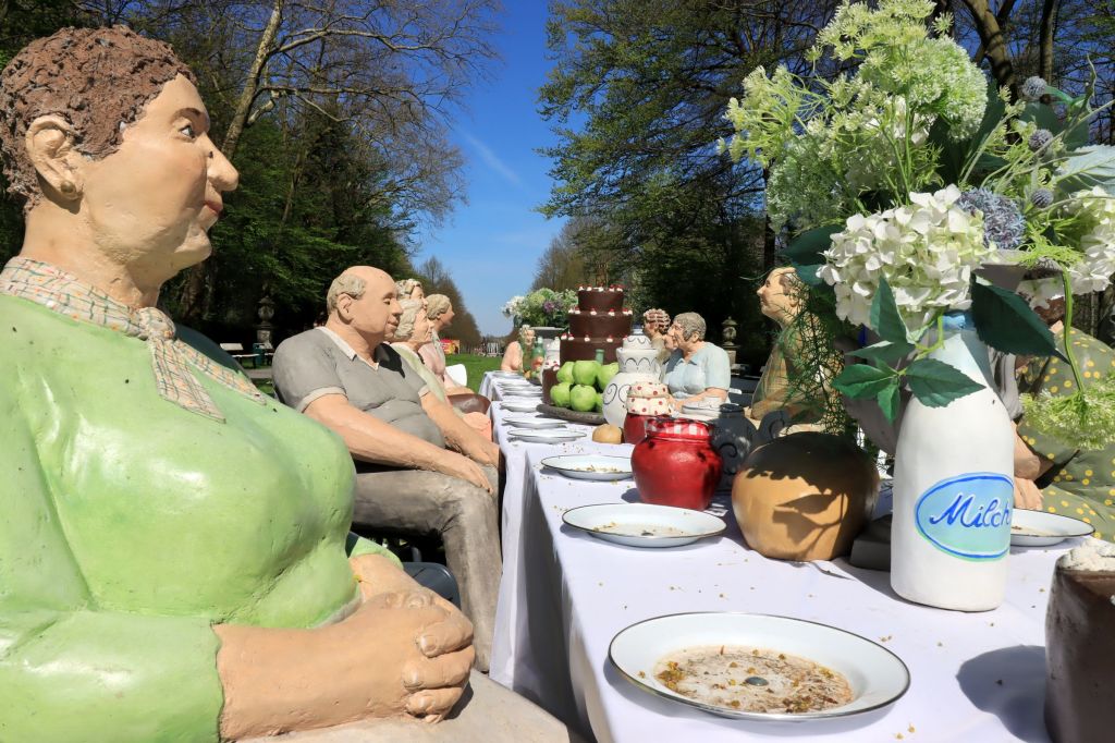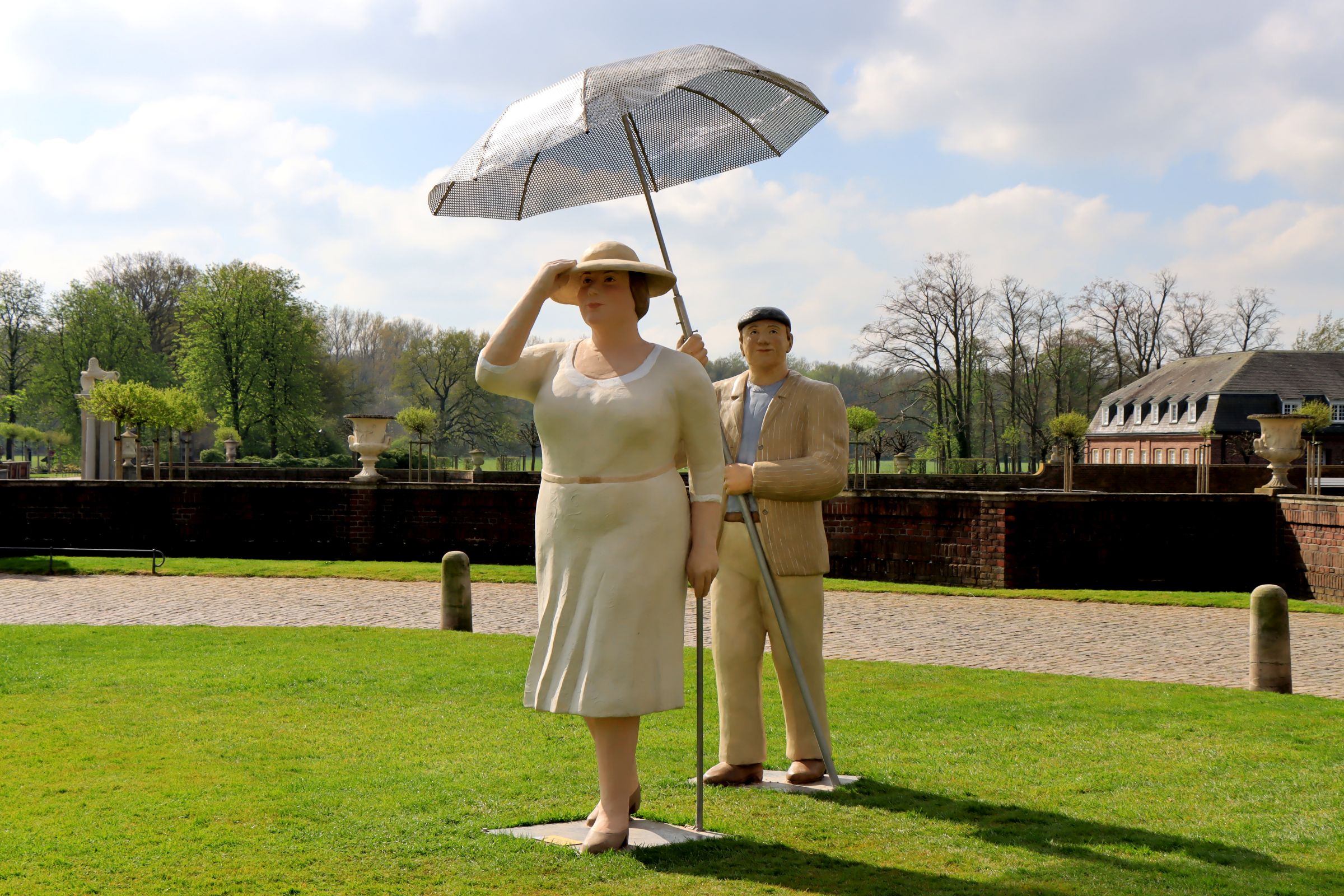 Den Alltagsmenschen bin ich erstmals 2016 in Rees begegnet, 2020 dann in Straelen (da stehen sie meines Wissens dauerhaft) und kurz darauf in Moers und Rheinberg. Alltagsmenschen sind die liebevollen Betonfiguren von Christel Lechner, die in alltäglichen Situationen dargestellt werden. Die Anreise nach Nordkirchen dauerte gut eine Stunde und 20 Minuten, dafür war um kurz nach 10.00 Uhr noch viel Platz auf dem Parkplatz am Schloss. Vom Parkplatz sind es nochmal rund 10 Minuten zu Fuß. Die erste „Alltagsdame“ begrüßt mich übrigens gleich auf dem Kreisverkehr.