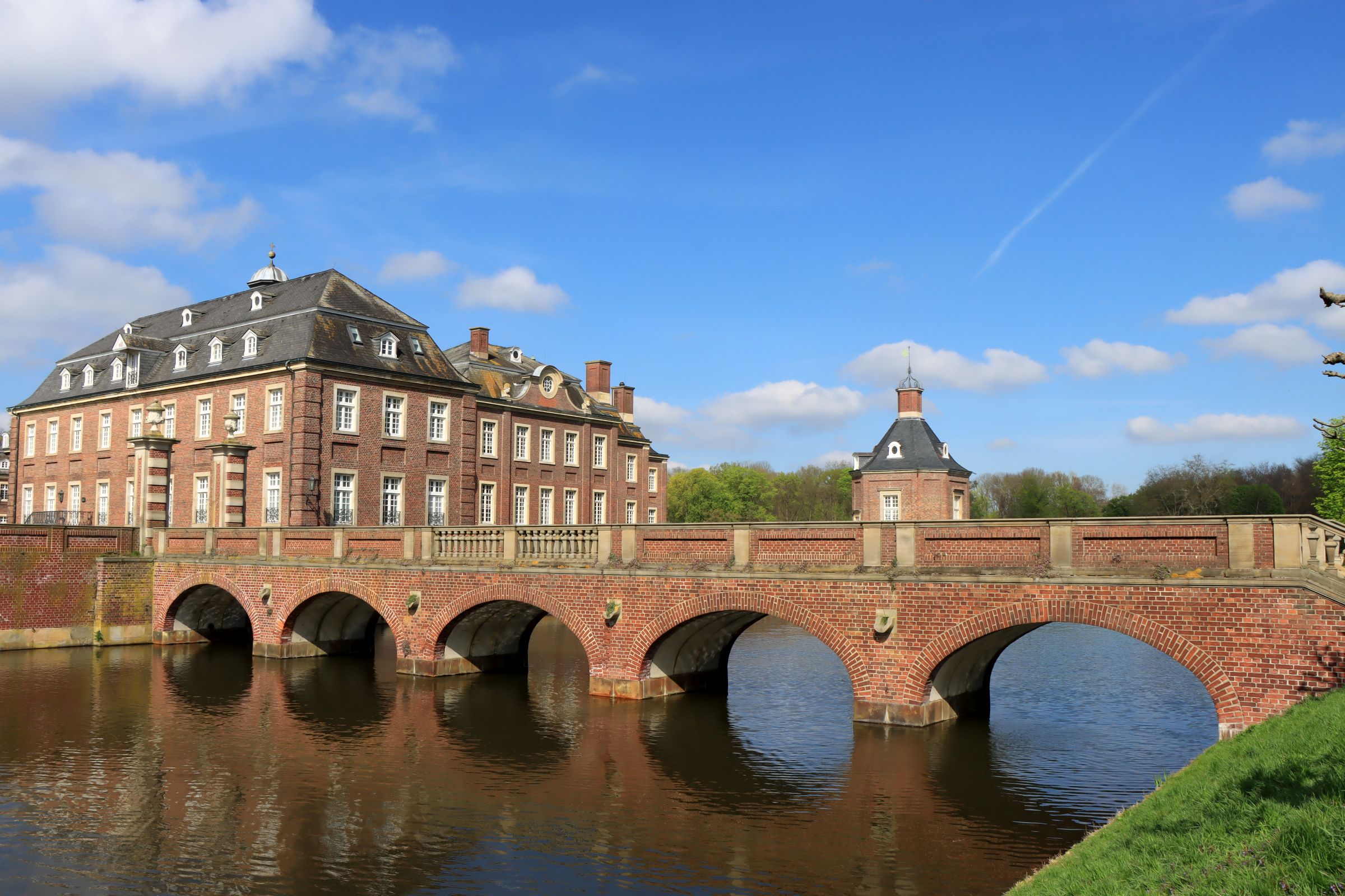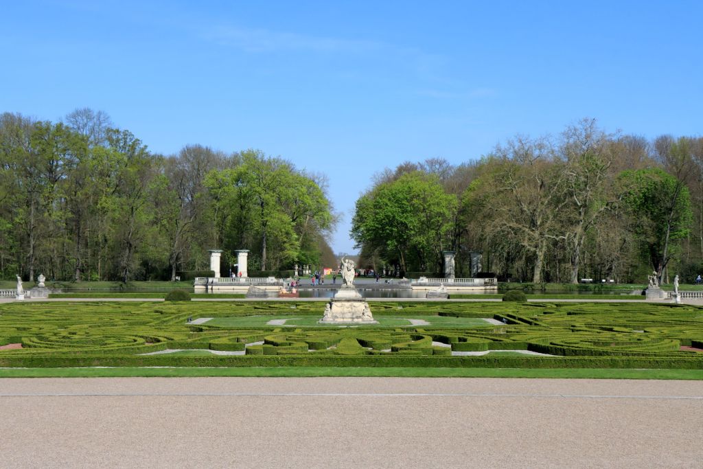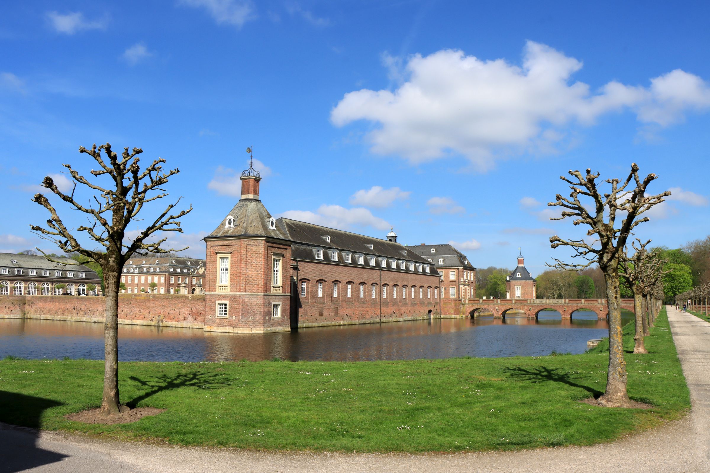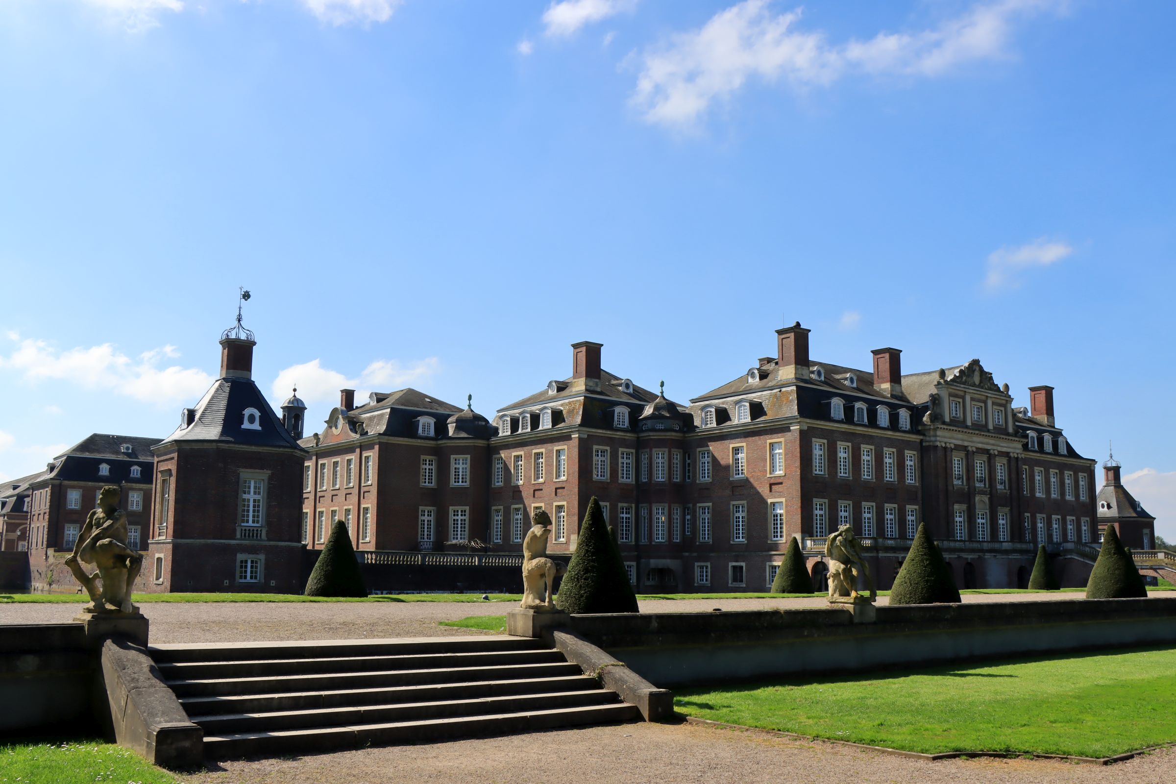 Das Tor ist offen, der Eintritt auf den Schloßhof frei und die Alltagsmenschen sind auch hier schon eingezogen. Rund um das Schlossareal verläuft ein Wassergraben, dann folgt der Weg über eine kleine Brücke in den Garten und drum herum verläuft wieder ein Wassergraben. Die barocke Schlossanlage wird zu Recht als das westfälische Versailles bezeichnet. Der Venusgarten, ein Inselgarten mit Blumen, Rasenflächen und zahlreichen Skulpturen, wurde erst zw. 1989 und 1991 vollständig wiederhergestellt. Die Ursprünge des heutigen Schlosses liegen zu Beginn des 16. Jahrhunderts, 1958 erwarb das Land die Schlossinsel samt Hauptgebäude und seit den 1970’er Jahren beherbergt das Schloss die Fachhochschule für Finanzen des Landes Nordrhein-Westfalen.
