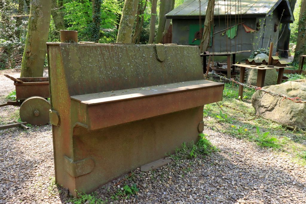 Besonders gefallen haben mir die Gebäude, die man betreten durfte und die durch Fenster- oder Dachflächen ganz besondere Lichteinfälle hatten. Bei dem sonnigen Wetter sind mir (auch das ist natürlich nur der subjektive Eindruck eines „Fotokünstlers“) ein paar gute Aufnahmen gelungen. Dazwischen rostige, roboterhafte Wesen, ein Klavier genauso wie ein Sarg aus Eisen und immer wieder blühende Büsche und Bäume. Auch wenn der Weg auf dem Begleitzettel klein aussieht, plant ruhig mal 2 Stunden ein.