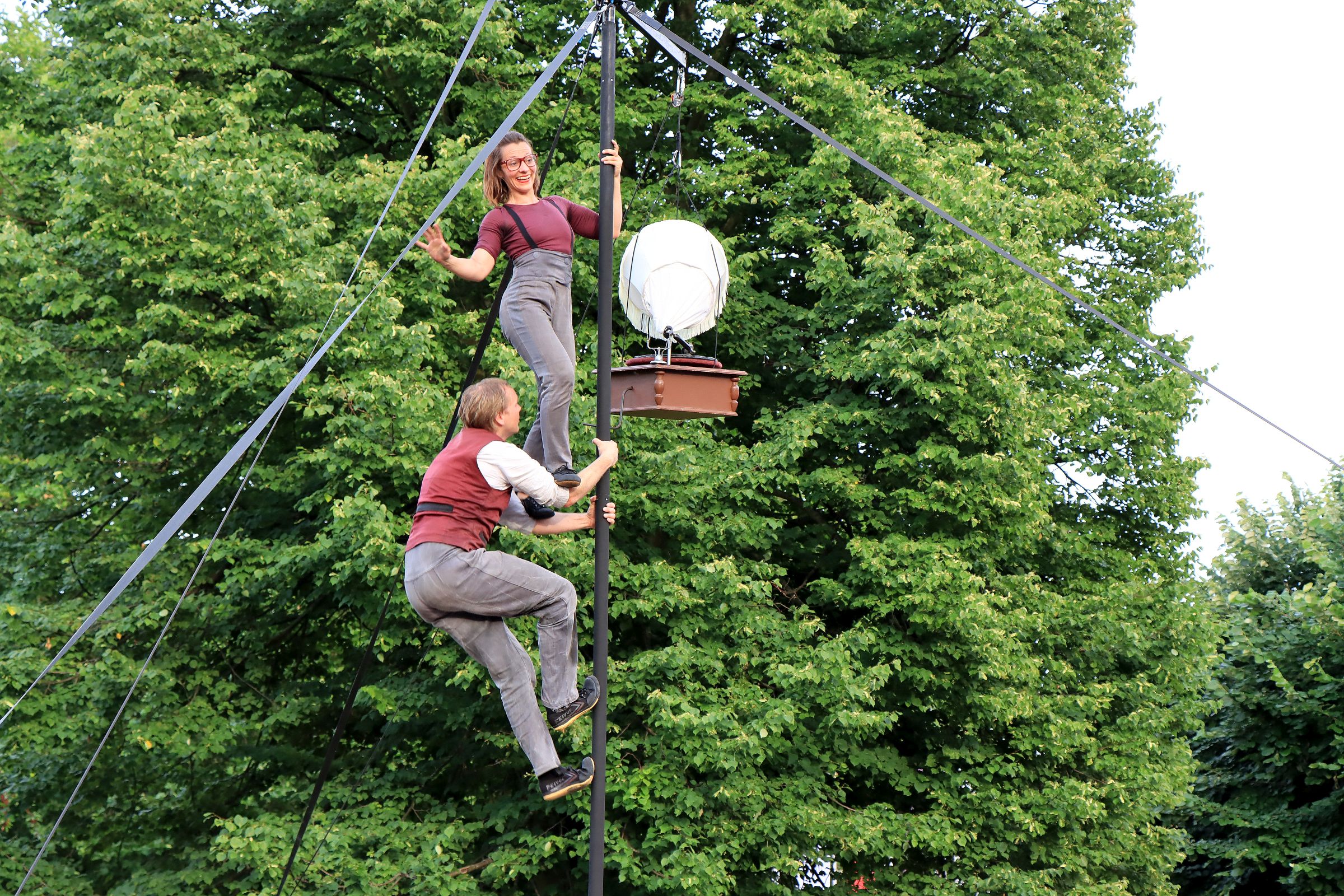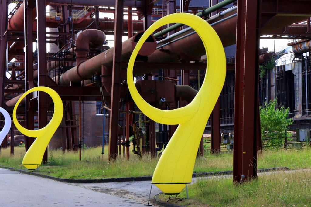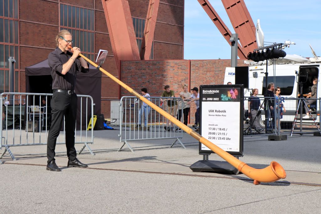Vor der Mischanalge stehen eine ganze Reihe von aufblasbaren … ich nenne sie mal Neunen, während die Feuerwehr noch das Wasserorchester mit Wasser versorgt. Ich entscheide mich, statt weiter zur Kokerei zurück auf den Vorplatz der Zeche Zollverein, seit 2020 Werner Müller Platz, zu gehen. Die Alphörner haben sich angekündigt und die kommen aus … nein nicht aus Bayern sondern aus Köln. AlpCologne heißt das Trio, das auch noch eine italo-amerikanische Sängerin präsentiert und La Paloma anstimmt. Mehr international geht wohl nicht. We are the robots, klingt es wenig später als Martin Riedel alias Ulik Robotic mit einer Maschine namens Paulin (einem Roboter aus der Automobilindustrie) zu einer Art Pooldance antritt. Beeindruckend und bei Roncalli auch schon in der Manege aufgetreten.