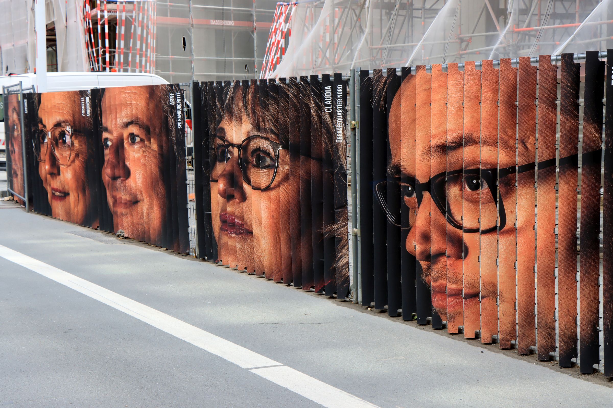 Auf dem Weg zum ersten Ziel komme ich am Westfield Überseequartier vorbei. Die Baustelle hat ein Kunstwerk mit dem Namen #Unueberseebar als Bauzaun bekommen. 33 Menschen, die bereits im Umfeld wohnen, wurden auf 385 m Länge auf dem Bauzaun portraitiert. Auf Kunststoffdreiecke (nicht Holz wie ich anfangs dachte) wurden 33 Gesichter aufgedruckt und bewegen sich sozusagen mit dem Betrachter, der an Ihnen vorbei geht. Alles zum Kunstwerk findet ihr auf ueberseequartier.de/unueberseebar.