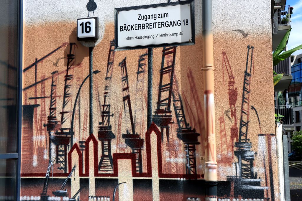 Danach ging es weiter ins Gängeviertel. Der Bäckerbreitergang stand schon länger auf meinem Zettel, aber irgendwie ist die Straße dann doch an mir vorbei gegangen. Das Gängeviertel erstreckte sich noch bis Mitte des 20. Jahrhunderts vom Hamburger Hafen über die Neustadt bis in die Innenstadt. Einige Gebäude sind nach der Choleraepidemie 1892 abgerissen worden, die Reste gingen im Zweiten Weltkrieg bzw. durch den Bau des Unilever-Hochhauses 1958-64 verloren. Heute stehen die Reste, wie aus der Zeit gefallen zwischen den Neubauten, haben aber ihren Platz gefunden. „Komm in die Gänge“ heißt es daher, denn Kunst und Kultur stehen in Ateliers und Werkstätten ebenso zur Verfügung wie auch Wohnflächen.