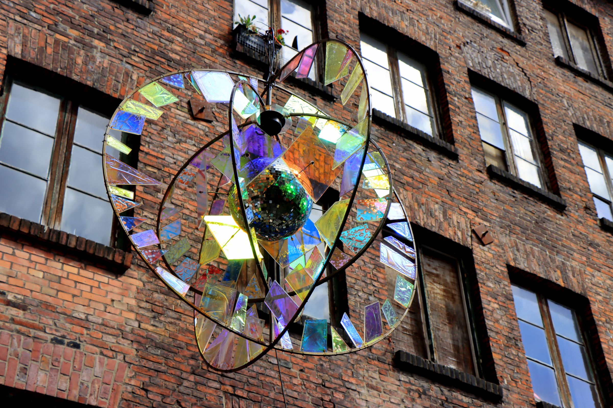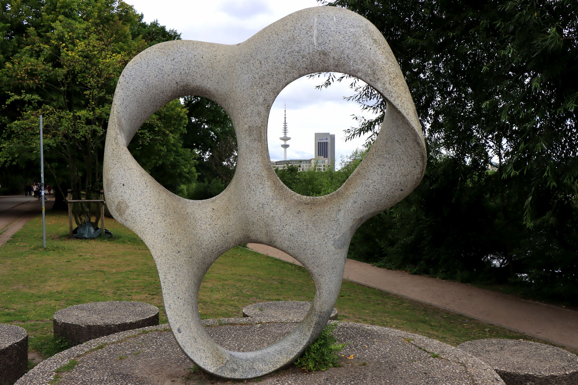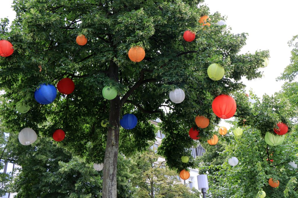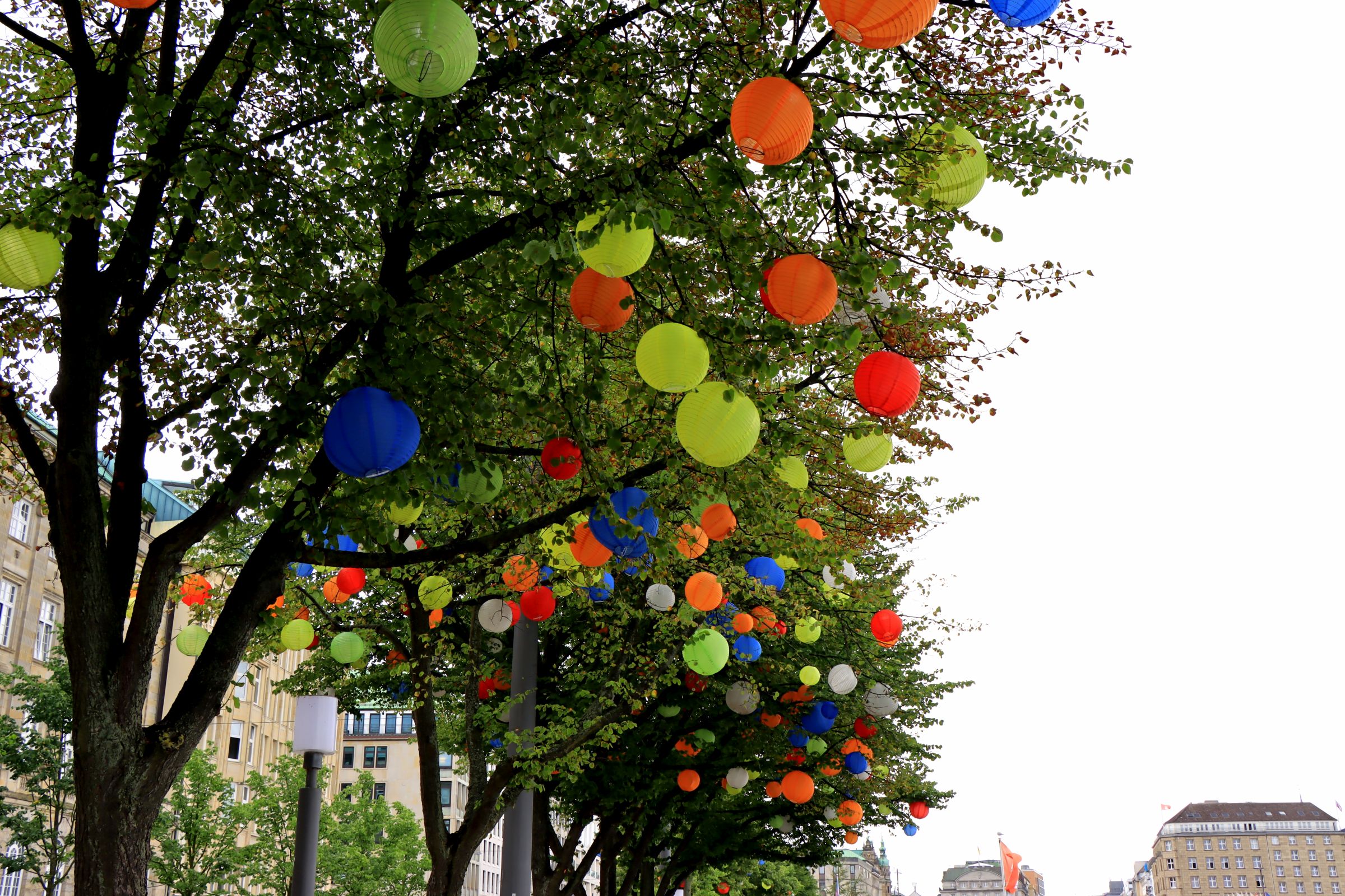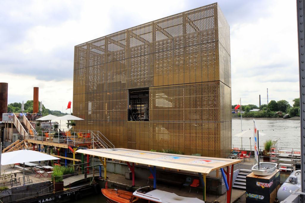 Das klingt gar nicht mal so aufregend, aber die gut gepflegten Grün- und Freiflächen sind plötzlich ganz weit weg von der Großstadt. Der Geheimtipp mündet an einem 10×60 m großen Ponton, auf dem der „goldene Pavillon“ steht. Diese Skulptur der Architekten Jan Kampshoff und Marc Günnewig ist 16 m hoch und 11 m lang, besteht aus goldfarbenem, gelochtem Messing und beinhaltet ein Restaurant. Zu Fuß braucht man für die 2 km etwa 30 Min. bis hierhin. Der angebotene Kuchen sah sehr lecker aus, allerdings kam ich ja gerade erst vom Frühstück. Also habe ich mir nur ein Alsterwasser gegönnt. Apropos Alster, die bin ich am Nachmittag entlang gelaufen, hauptsächlich um die 100’te Lampions zu bewundern, die dort in den Bäumen hingen und diese Skulptur „Rhythmus im Raum“ (hat was von Screem).
