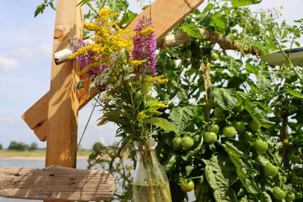Wie schon im letzten Jahr wurde auch 2022 das (Krefeld) Uerdinger Rheinufer wieder temporär bepflanzt, um den Uferbereich zu begrünen. Insgesamt stehen am Ufer bei Rheinkilometer 765 fünfzig Blumenkästen, gepflegt von Schulen, Vereinen und Freundeskreisen. Dieses Jahr ist das Thema „Essbares Krefeld“. D.h. neben bunten Blumen wachsen in diesem Jahr in den Beeten Salat, Gewürzkräuter und z.B. Tomaten, um irgendwann geerntet zu werden.