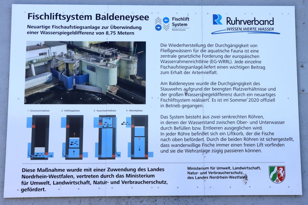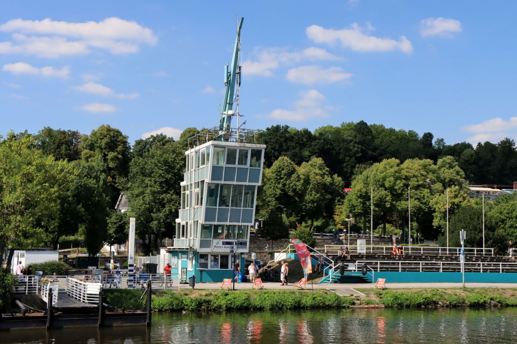 Vom Regattaturm ging es über das Stauwehr auf die gegenüberliegende Seite. Das Stauwehr hat übrigens seit einiger Zeit einen Fischaufzug, mit dem Fische das Wehr überwinden können. Wie das funktioniert, seht ihr auf dem Bild oben (Mitte). Ich hatte mir vorgenommen bei 25 Grad einfach entspannt am Ufer entlang zu laufen. Als der Regattaturm langsam kleiner wurde und ich eine knappe Stunde unterwegs war, stellte sich die Frage zurück- oder weitergehen? Ich war unschlüssig und studierte am Mobiltelefon den Fahrplan der Weißen Flotte. Die nächste Abfahrt war in 20 Minuten ab Haus Scheppen. In 20 Minuten? Um das zu schaffen hätte ich rennen müssen, bei 25 Grad keine Freude.
