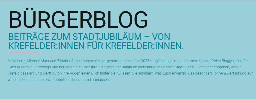 Passend dazu hat die Stadt Krefeld Jubiläumsblogger/-innen gesucht, die euch mitnehmen zu großen und kleinen Veranstaltungen, die für euch auch mal hinter die Kulissen schauen und auf der o.g. Seite ihre Geschichten erzählen. Ich darf jetzt verkünden, daß ich dabei sein werde. Natürlich gibt’s auch hier im nächsten Jahr das eine oder andere zu lesen. Noch ist das genaue Programm geheim, aber sobald ich mehr erfahre, berichte ich (auch) an dieser Stelle. Haltet in den sozialen Median nach den Hashtag #Krefeld650 Ausschau.