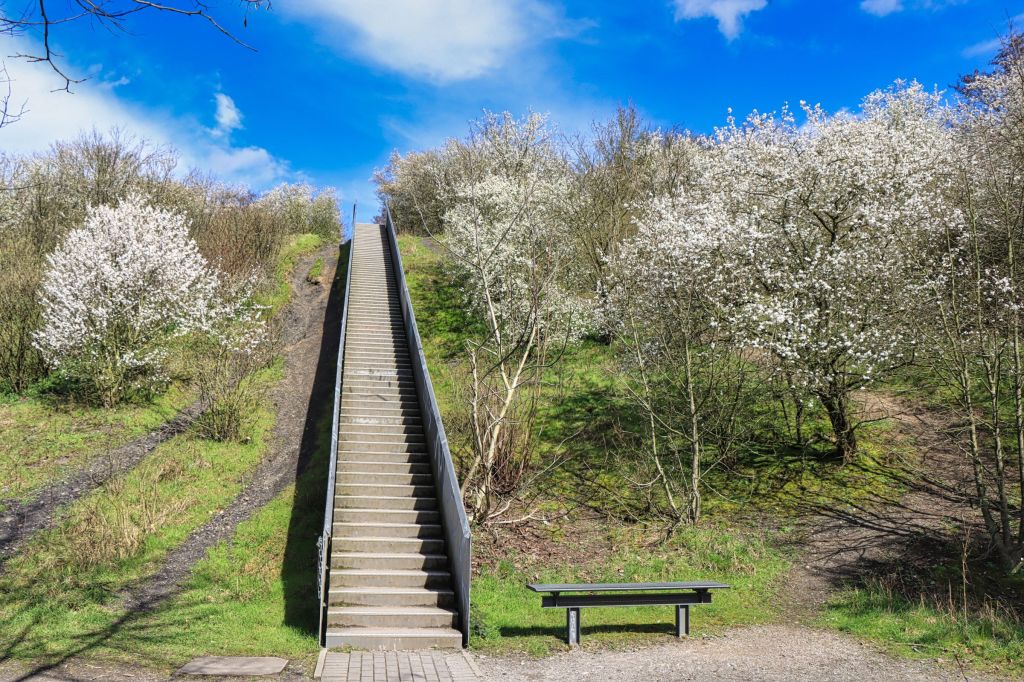 Das schöne an der Halde Norddeutschland ist, auf der Halde grünt und blüht es, wenn der Frühlung Einzug hält. Richtung Westen geht der Blick fast bis in die Niederlande, in Richtung Osten kann man z.B. den Rhein, das Gasometer in Oberhausen und die Kokerei Schwelgern erblicken. Das Bild der Kokereiwolke zeigt, daß es über Duisburg relativ windstill war. Wenn ihr auch mal gucken wollt, die (restlichen) Bilder dieses Beitrags gibt’s wieder bei Flickr und Google Photos.