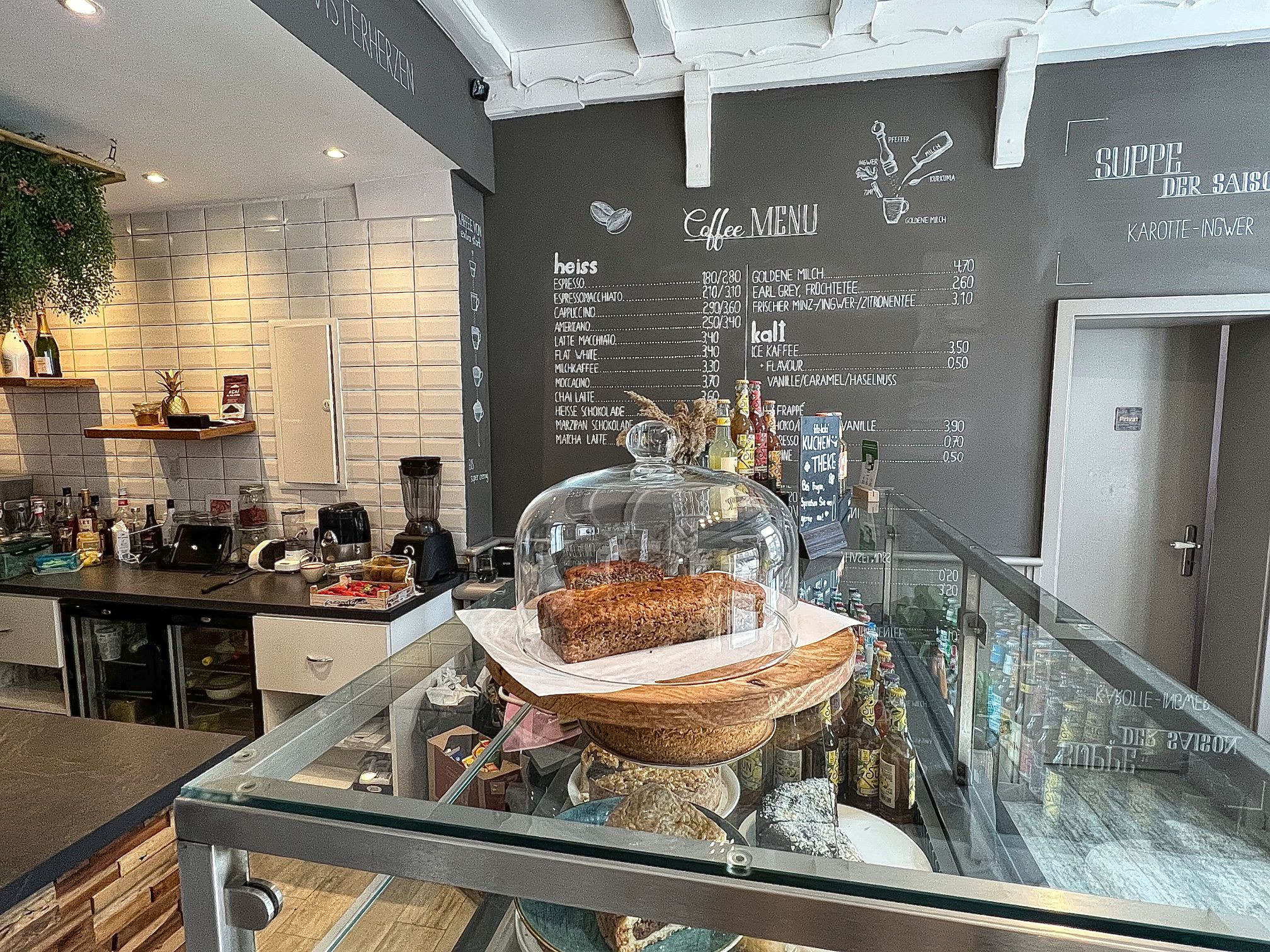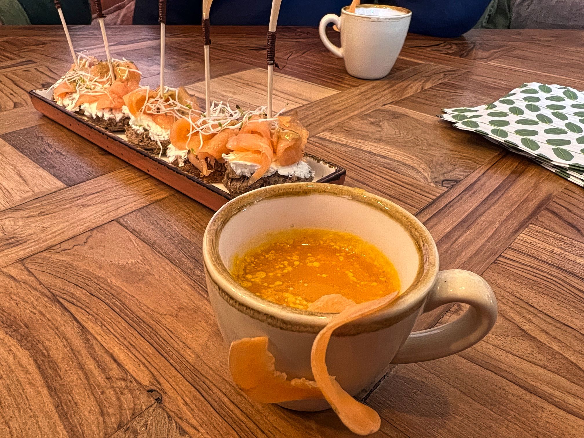 Der Rundgang startete im Café Geschwisterherzen am Karlsplatz, direkt gegenüber des Kaiser Wilhelm Museums. Wir beginnen mit einem kleinen Karotten Ingwer Süppchen, dazu kleine Canapes mit Quark, Lachs und Senf. Leider gestattete der Abstecher nur einen kurzen Rundumblick in diesem liebevoll eingerichteten Cafe, das noch mit viel mehr Leckereien lockt.