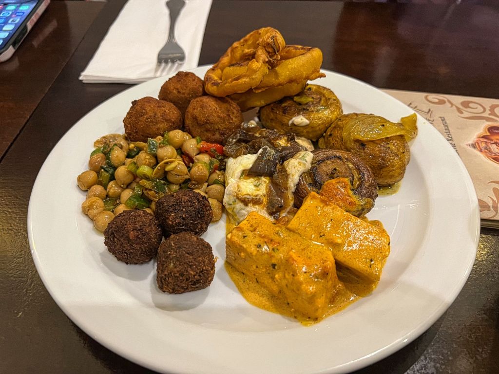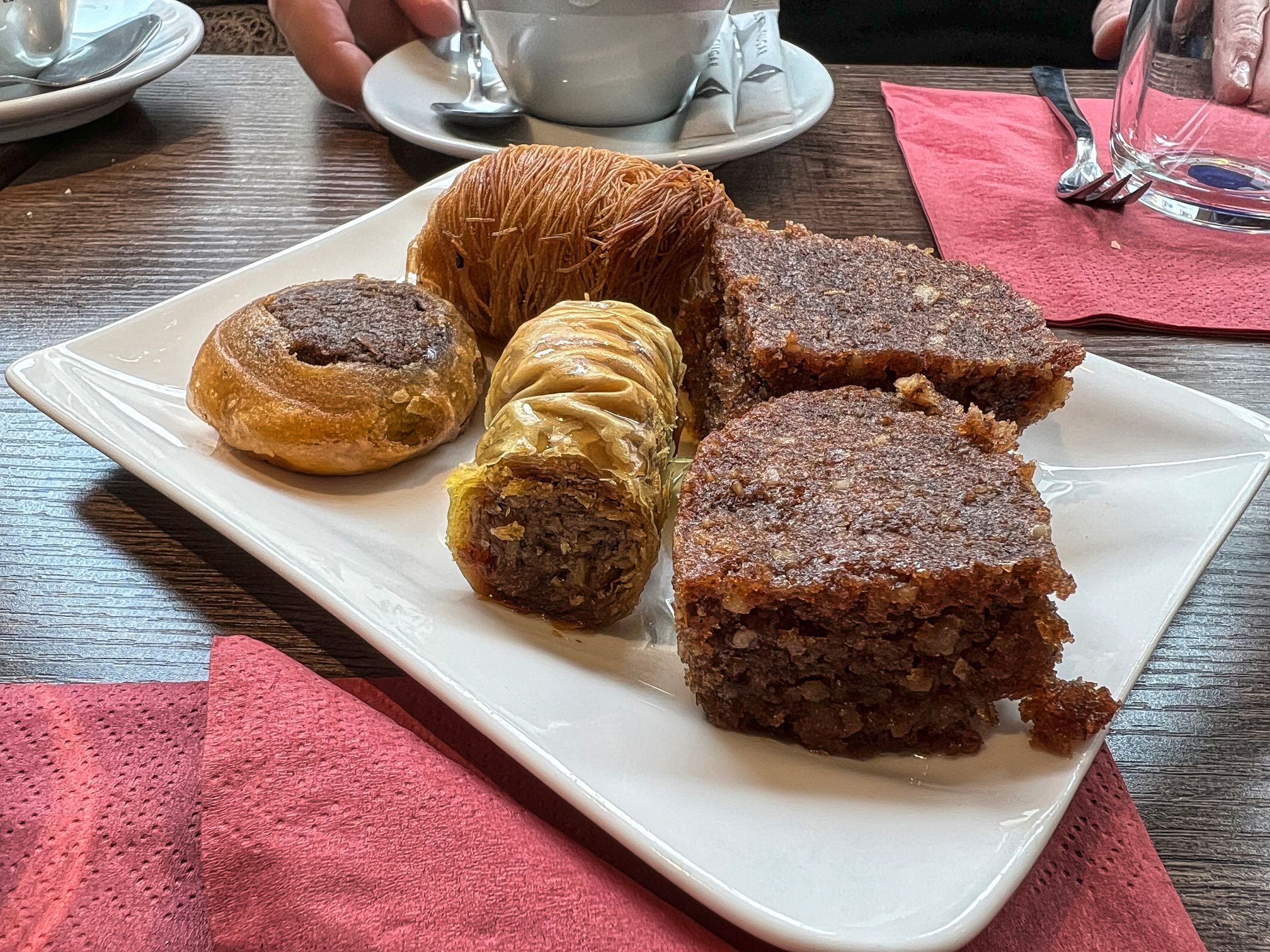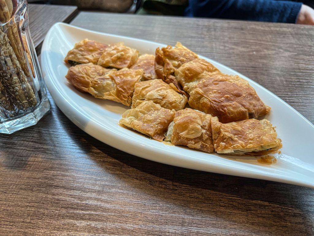 Für uns gings eine Ecke weiter zum griechischen Café Geschmackssinn an der Marktstraße. Zuerst gab es für jeden Gast ein Glas Wasser, dazu erwartete uns bereits Blätterteiggebäck mit Spinat und Schafskäse, verschiedene Dips, kleine Kuchenköstlichkeiten mit Honig, Nuß und ein (ital.) Cappuccino. Alle diese Köstlichkeiten gibt es hier übrigens auch zum Mitnehmen.