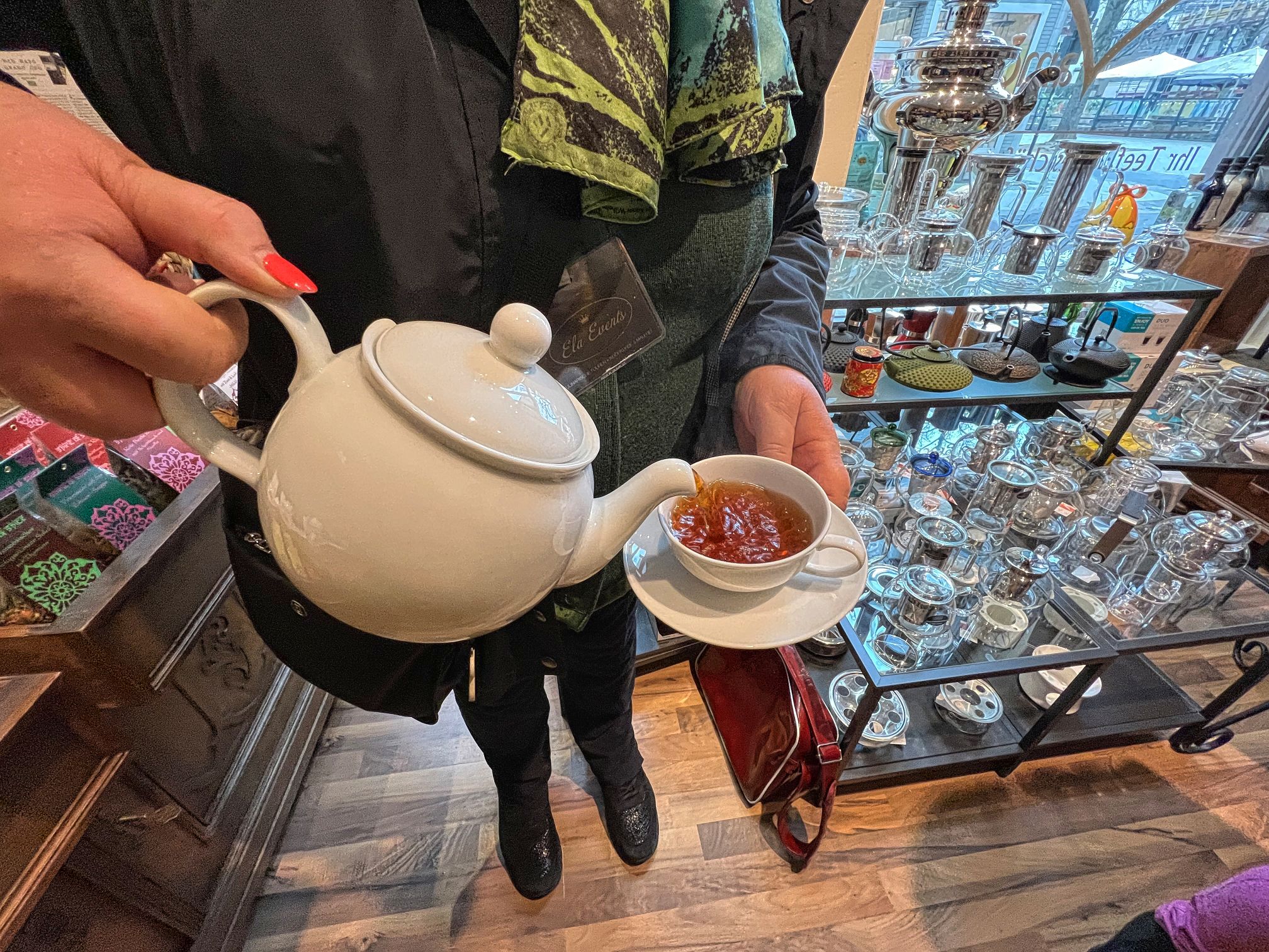 Nach dem Essen ein paar Schritte zu Fuß, ein paar Regentropfen fallen, macht aber nichts, wir sind zu einer Teepause im TEAamo eingeladen. Der Teeduft erwartet uns bereits beim Betreten des Ladens. Geschätzt 250 verschiedene Teesorten können hier (lose) erworben werden, drei davon wurden für uns frisch aufgebrüht. Almkräuter, grüner Tee und ein Darjeeling. Natürlich auch hier ein paar süße Verführungen und Knabbereien und ein Überraschungstütchen mit ein paar Beutelchen Tee.