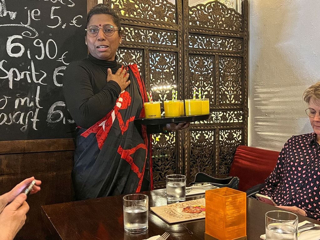 Es regnet immer noch, macht aber nichts, gleich gegenüber vom Schwanenmarkt (Hintereingang) befindet sich das indische Restaurant Namaste. Auch hier erstmal ein Glas Wasser, dann folgen die würzigen Köstlichkeiten. Kichererbsen und gleiche Bällchen, Zwiebelringe, Käse in einer delikaten Sauce, ein Brot … bitte verzeiht, wenn ich mir nicht alle Leckereien merken konnte. Besonders lecker war das Mangolassi (eine Art Trinkjoghurt), das die Geschmacksnerven wieder beruhigt.