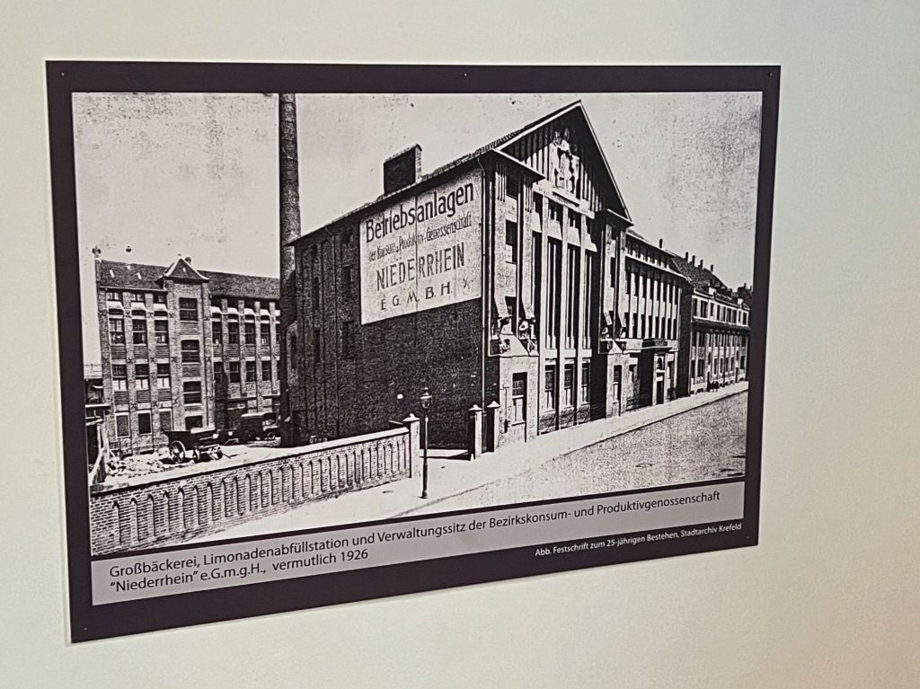 Wir schreiben den Beginn des 20. Jahrhunderts, Karl Buschhütter erbaut nahe des Krefelder Hauptbahnhofs ein Zentrallager für die Genossenschaft „Bezirkskonsum- und Produktivgenossenschaft Niederrhein“. Das Gebäde wurde erbaut in Stahlbetonbauweise und anschließend mit Klinkern verkleidet (das Bild unten links). Kurz danach entsteht gleich gegenüber eine Großbäckerei und Limonadenabfüllstation durch den Architekten Robert Adrian (das Bild oben). Beide Gebäude haben mittlerweile mehr als 100 Jahre auf dem Buckel und eine wechselvolle Geschichte hinter sich.