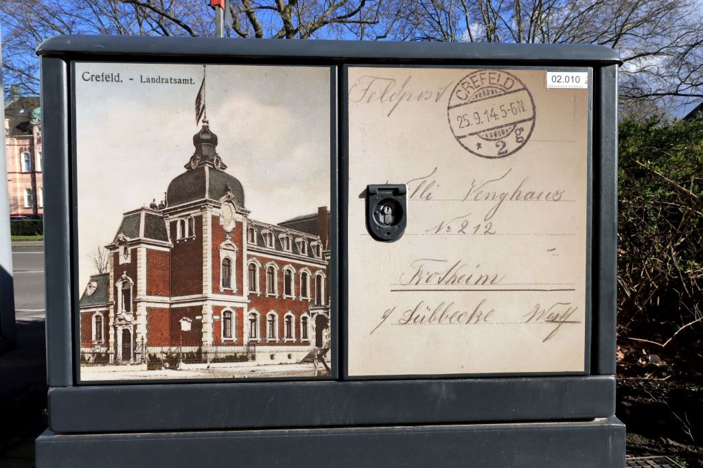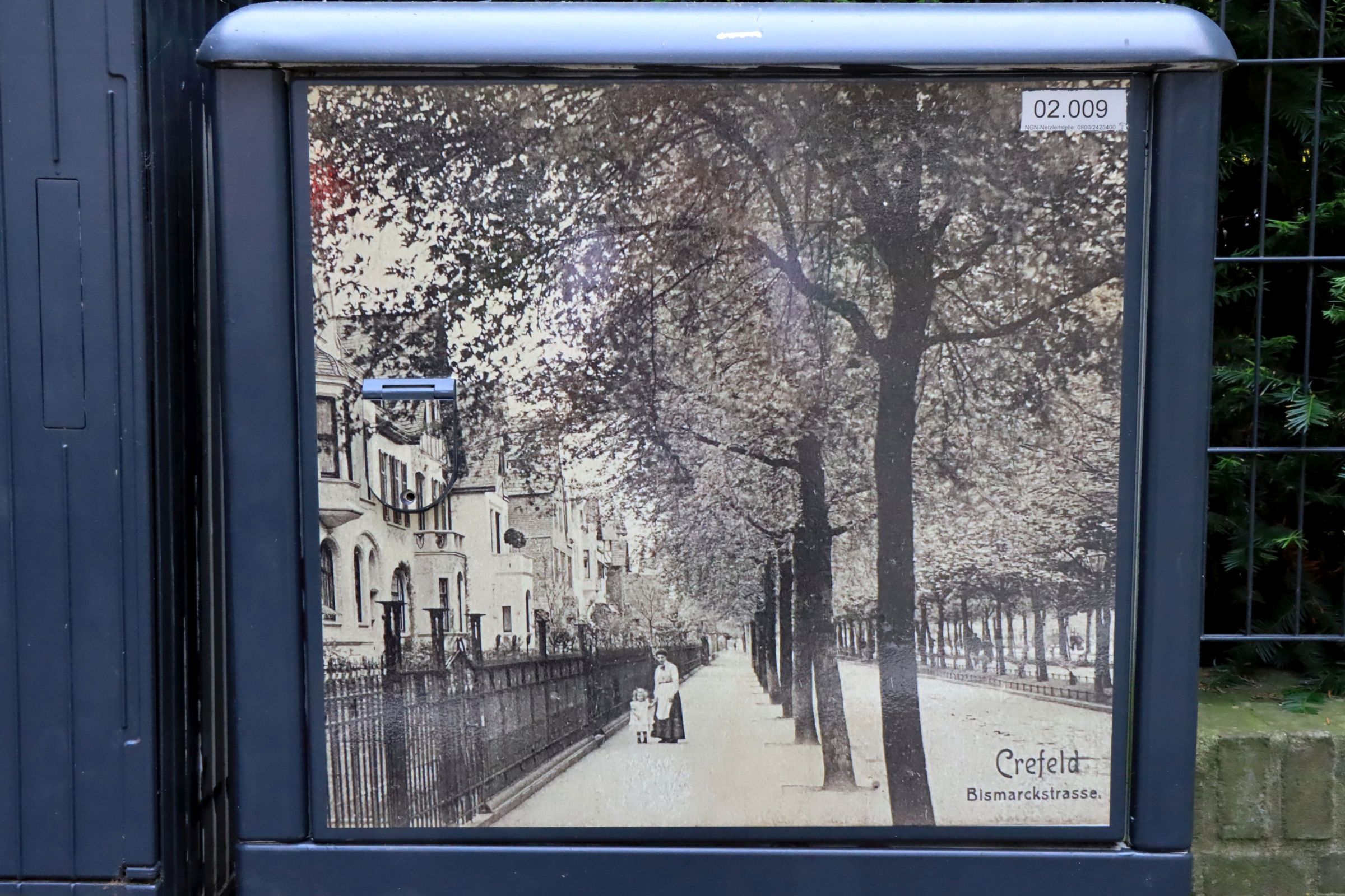 Vielleicht erinnert ihr euch, daß ich mich 2021 in zwei Blogbeiträgen *) in meinem näheren Umfeld umgesehen habe und erstaunt war, wieviel Strom-, Post- und sonstige Verteilerkästen so am Straßenrand herumstehen. Ich habe den Blogbeitrag heute noch einmal neu zusammengefaßt (und auch in den Krefelder Jubiläumsblog Krefeld650.de gestellt). Angefangen hat es beim meinem Bäcker um die Ecke. Am Krefelder Bismarckplatz klebte plötzlich ein Bild eben dieses Platzes aus dem letzten Jahrhundert auf dem Verteilerkasten.