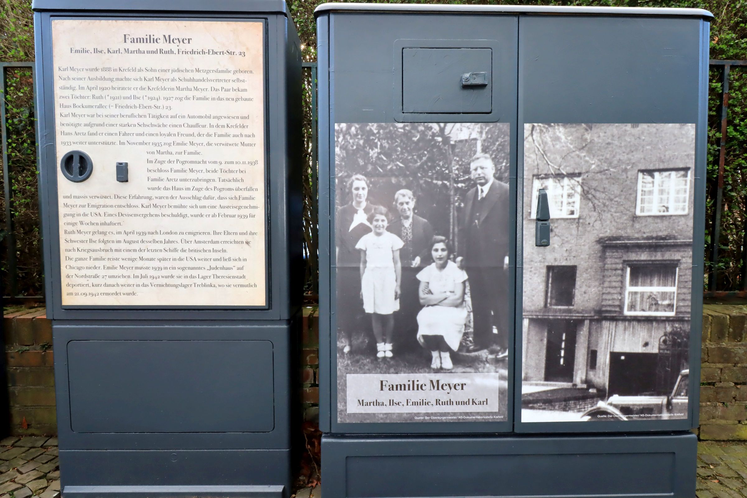 Um die Ecke befindet sich die Villa Merländer, bekannt als NS-Dokumentationsstätte der Stadt Krefeld (ich schrieb hier darüber). Die Verteilerkästen bieten die Gelegenheit auf jüdische Geschichte in dem Viertel aufmerksam zu machen. Zusammen mit der NS-Dokumentationsstätte und dem Stadtarchiv Krefeld wurden Bilder von Menschen und Familien ausgesucht, die hier gewohnt oder gearbeitet haben.