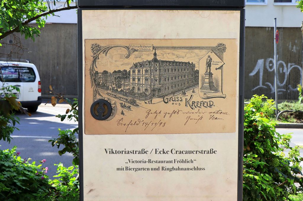Der Namensgeber der Friedrich Ebert Straße, eben jener Friedrich Ebert, war sogar mal auf der 5,- DM Münze. Na, wer hat’s gewußt? Die Wilhelmshofallee, heute eine Durchgangsstraße vorbei an Haus Lange und Haus Esters ist noch gesäumt von schönen Häusern und Villen, wie sich auf einem alten Foto am Verteilerkasten wiedererkennen läßt. Gleich daneben wird erklärt, wie hier Ende des 19. Jahrhunderts die Baugebiete entstanden und Krefeld sich vergrößerte.