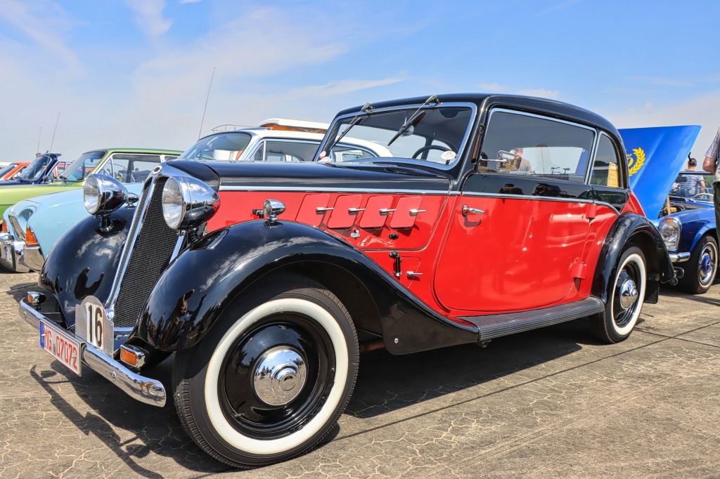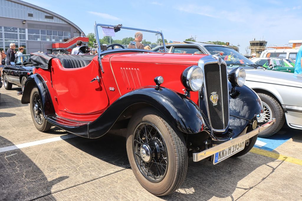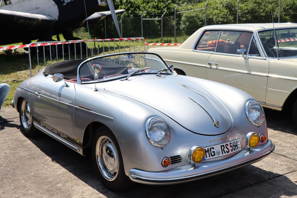 Ich war das zweite Mal beim Oldtimertreffen am Flughafen Mönchengladbach. Es zeichnet sich durch die Mischung aus PKW, LKW, Landmaschinen, Motorrädern, Rollern, alle älter als 30 Jahre und eben Flugzeugen aus. Allerdings ist der Platz für PKW/LKW begrenzt. Das heißt wer früh kommt, darf durch den Hugo Junkers Hangar auf das Flughafenvorfeld fahren, alle anderen müssen leider auf dem Besucherparkplatz zwischenparken, was zu etwas Unmut führte. Der besagte Rückstau rief sogar die Polizei auf den Plan, die an allen vorbei nach dem Rechten sah.