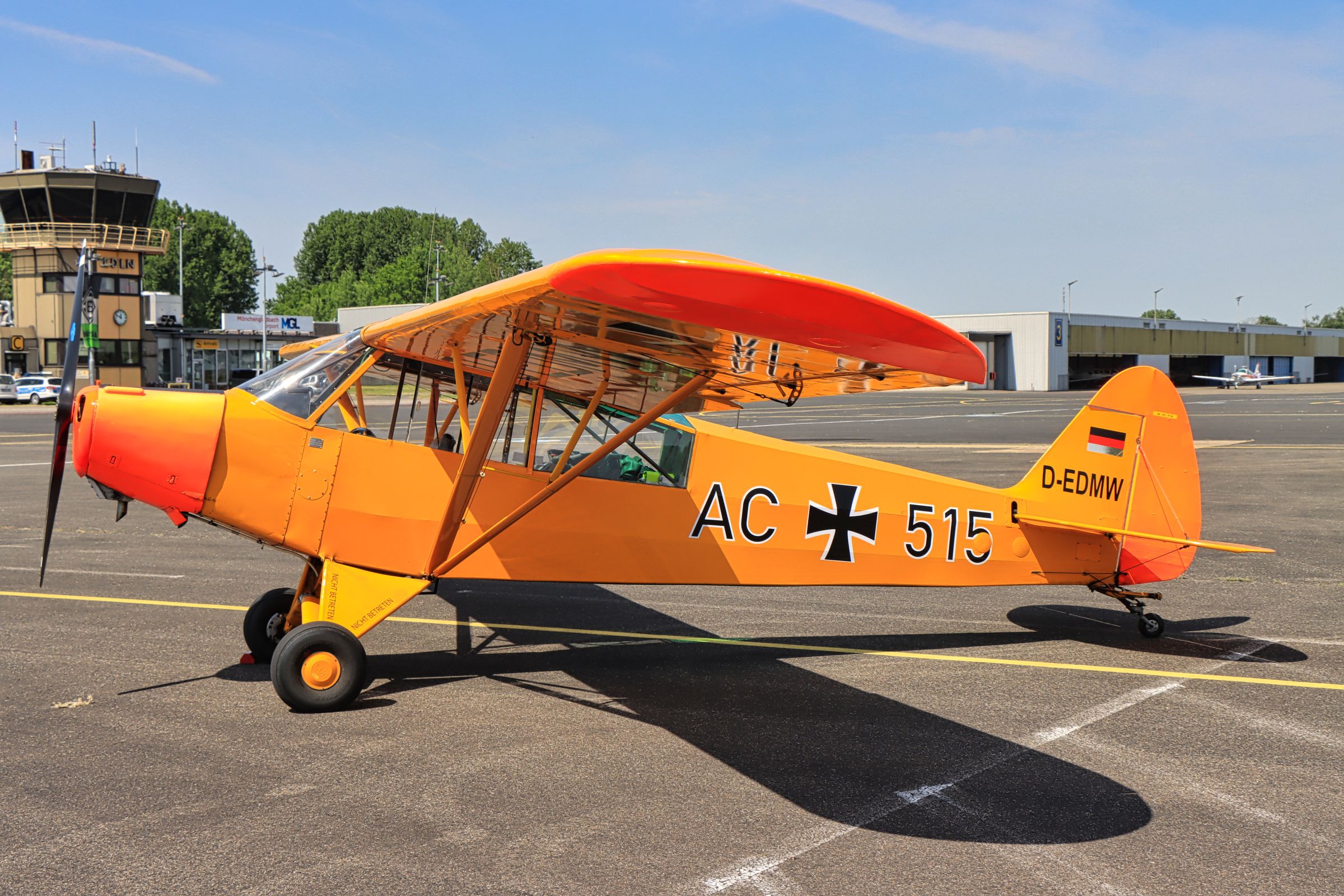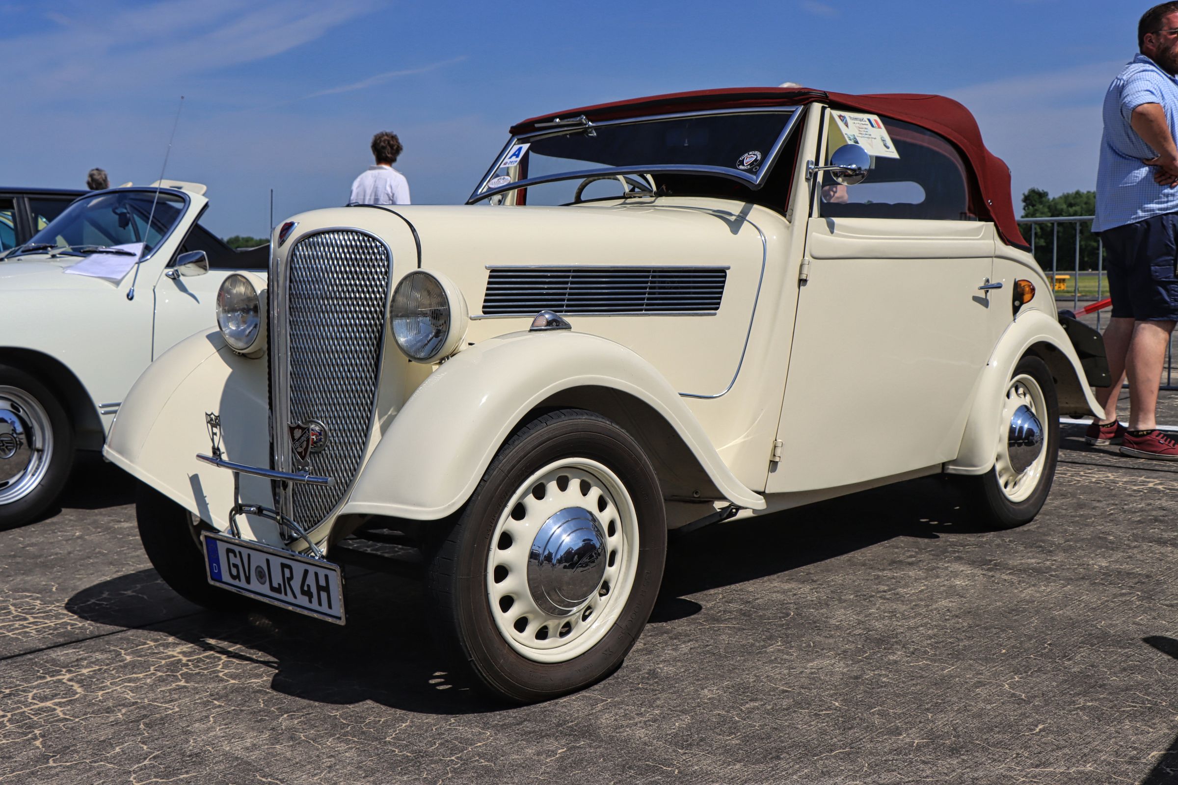 Ich war das zweite Mal beim Oldtimertreffen am Flughafen Mönchengladbach. Es zeichnet sich durch die Mischung aus PKW, LKW, Landmaschinen, Motorrädern, Rollern, alle älter als 30 Jahre und eben Flugzeugen aus. Allerdings ist der Platz für PKW/LKW begrenzt. Das heißt wer früh kommt, darf durch den Hugo Junkers Hangar auf das Flughafenvorfeld fahren, alle anderen müssen leider auf dem Besucherparkplatz zwischenparken, was zu etwas Unmut führte. Der besagte Rückstau rief sogar die Polizei auf den Plan, die an allen vorbei nach dem Rechten sah.
