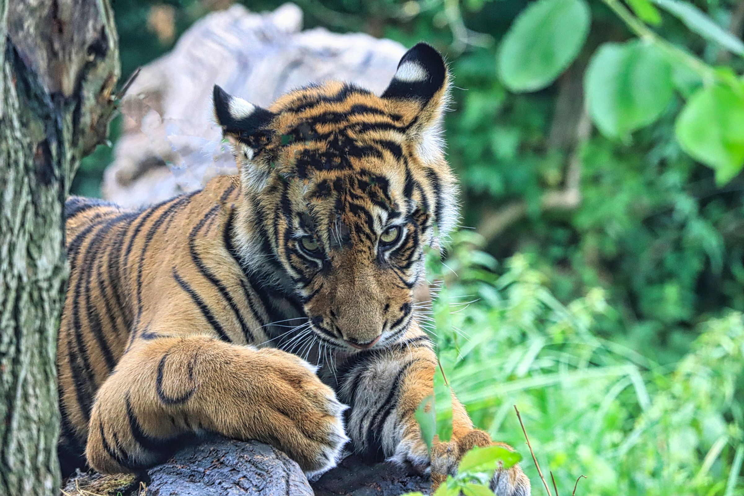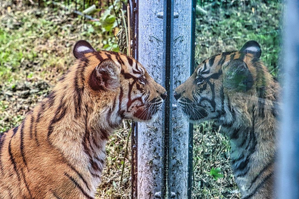 Umlagert ist in den Mittagsstunden seit Jahresbeginn das Tigergehege, denn nach einer längeren Durststrecke haben im November letzten Jahres zwei (drei) junge Tiger das Licht der Welt erblickt. Nachdem sich das Tigerweibchen Mau anfangs abweisend gegenüber dem Tigermännchen Leopold zeigte kamen am 6. November drei Jungtiere zur Welt. Zwei davon haben überlebt, ein Kater und eine Katze erforschen jetzt Mittags das Außengelände oder liegen manchmal auch nur schlafend auf einem Baumstamm oder im Gras.